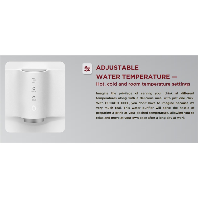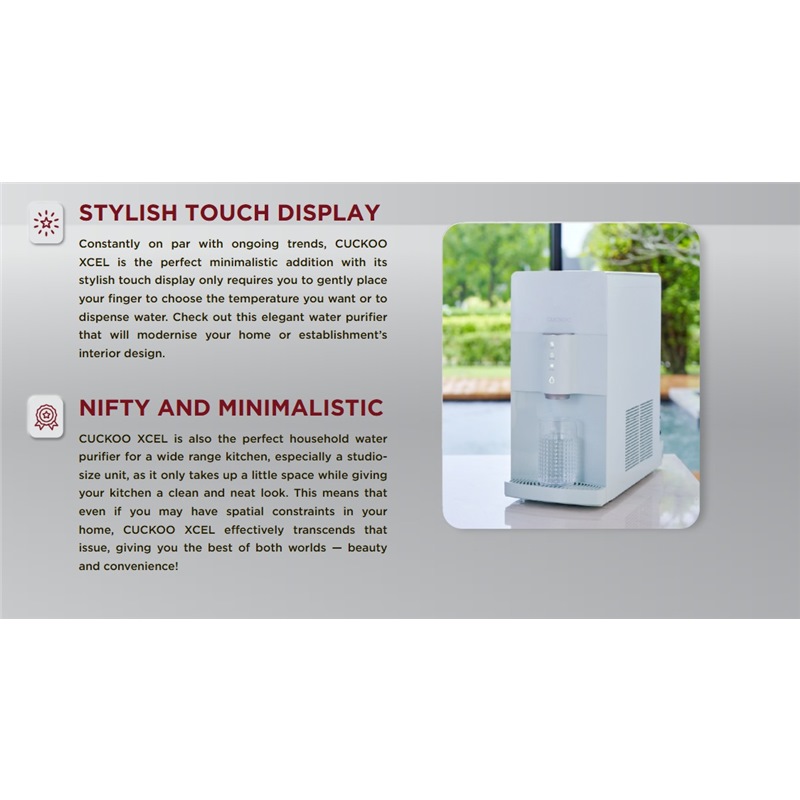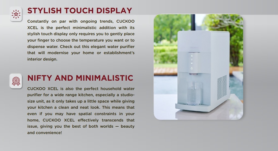Always keeping up with the latest trends, CUCKOO XCEL features a minimalistic touch display that allows you to select your desired water temperature or dispense water with a simple touch. Elevate your home with this sleek and elegant water purifier.
