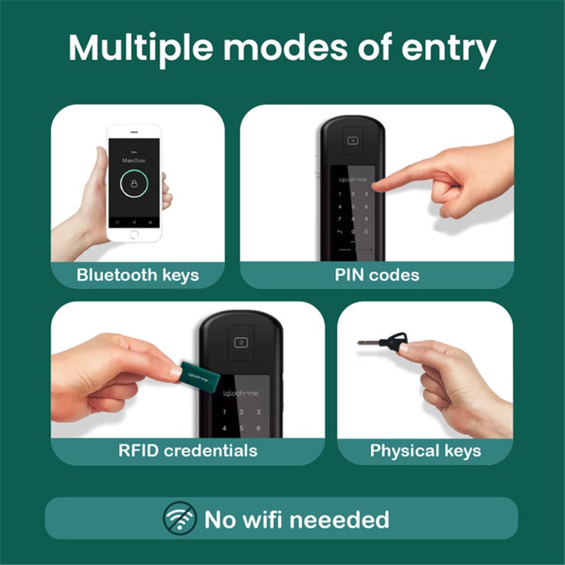 Mutiple modes of entry (PIN codes, Bluetooth keys, RFID tags and stickers, physical backup keys)