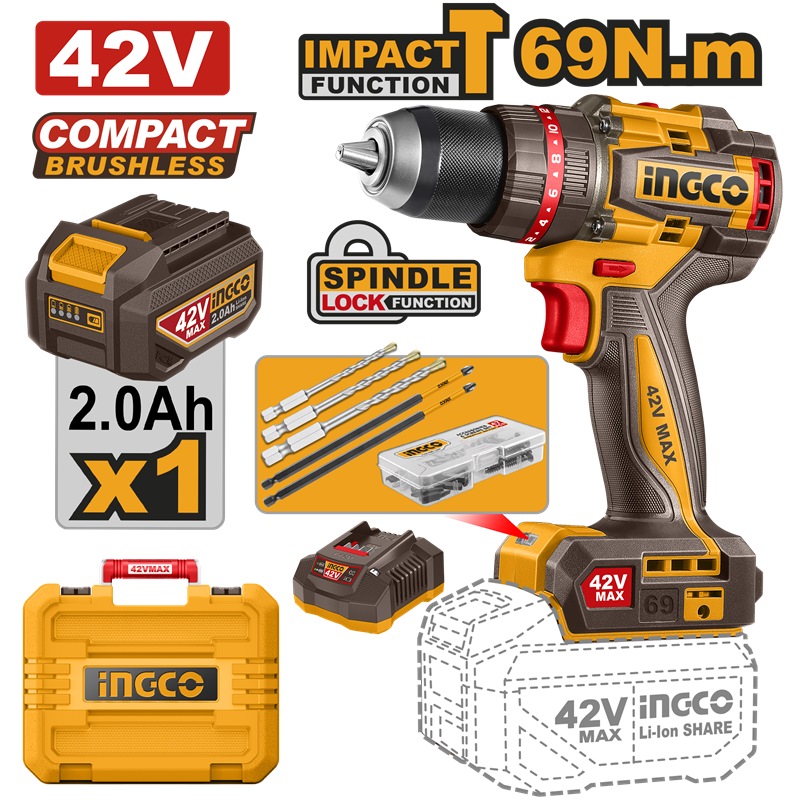 INGCO 42V BL COMPACT IMPACT DRILL 69NM 1X2.0AH & CASE CIDLI426981