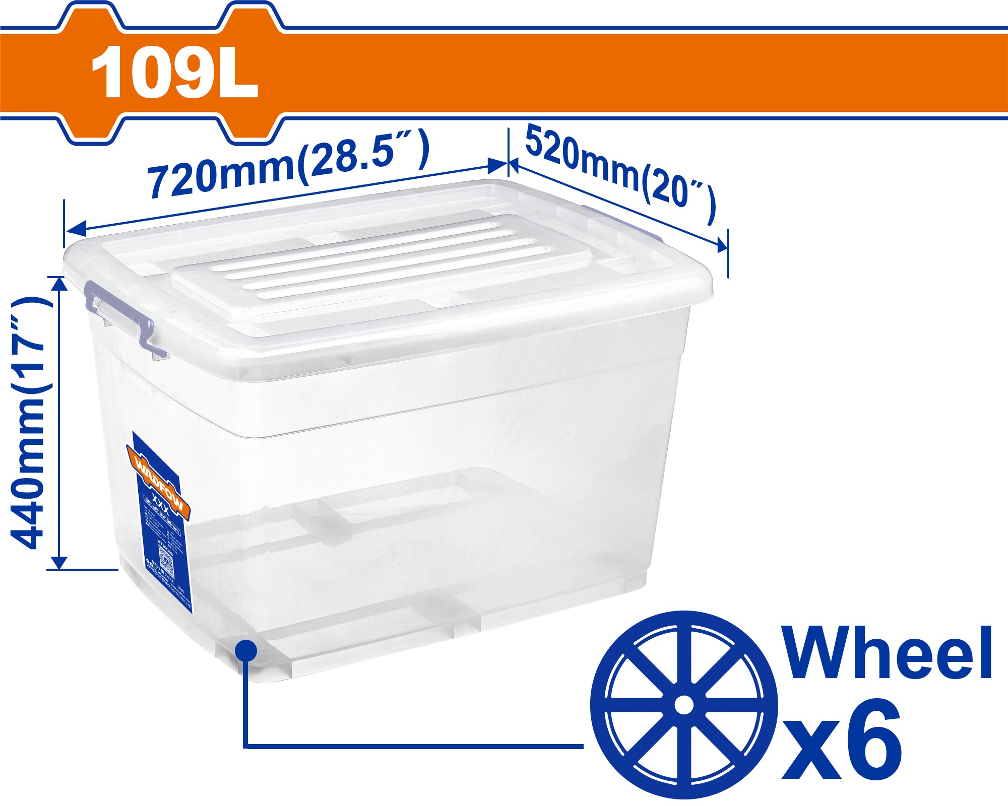 WADFOW 109L CLEAR STORAGE BOX W/6 WHEELS 28.5"X20"X17" WTB251B