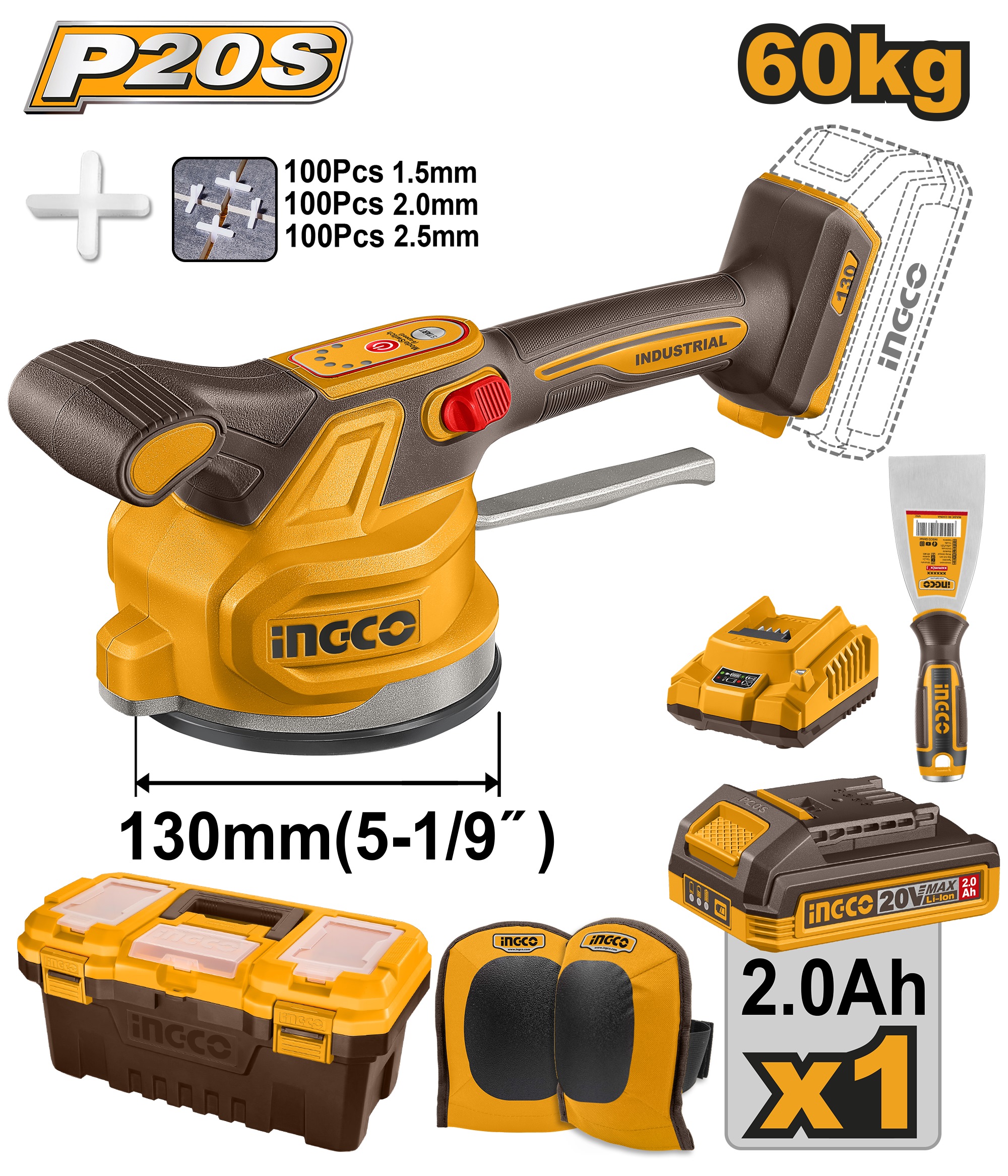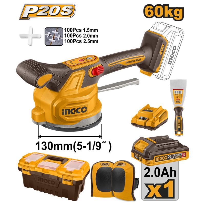 INGCO 20V TILE VIBRATION MACHINE1X2.0AH CHARGER KNEE PADS+BOX CTVLI20015