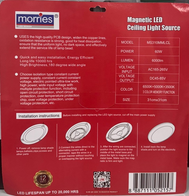 Home » Electrical & Lighting » LED Lights & Light Bulbs » MORRIES 5000-5500 LUMEN 60W LED CIRCULAR MAGNETIC CEILING PANEL MS310MMLCL