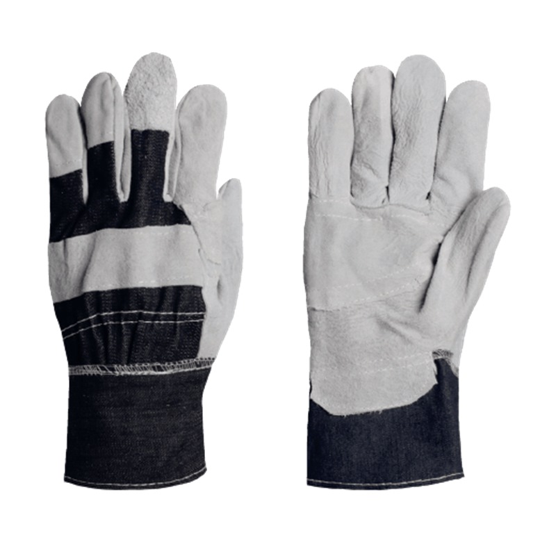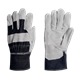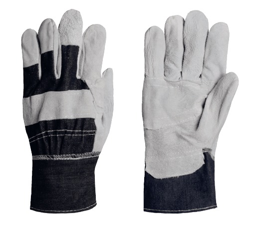 Grey cow split leather, patched palm, denim back and cuff, palm-lined.
