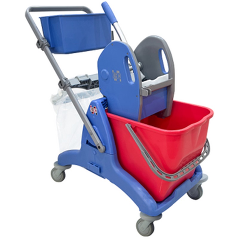 Klenaway Compact 25 litres mopping trolley on 4 x Ø 80mm 100% rust-free castors with bumpers, tray, waste bag holder with support base and c/w heavy duty mop wringer.