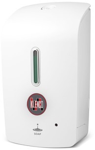 KLENCO ENVON Auto Hand Sanitizer Dispenser of elegant design impact-resistant ABS (white) housing with key-lock, 600ml refillable container, pump dispenses 1200 x 0.5ml/ 600 x 1.0ml solution and battery low indicator LED light. (excludes 4 x “AA” batteries).