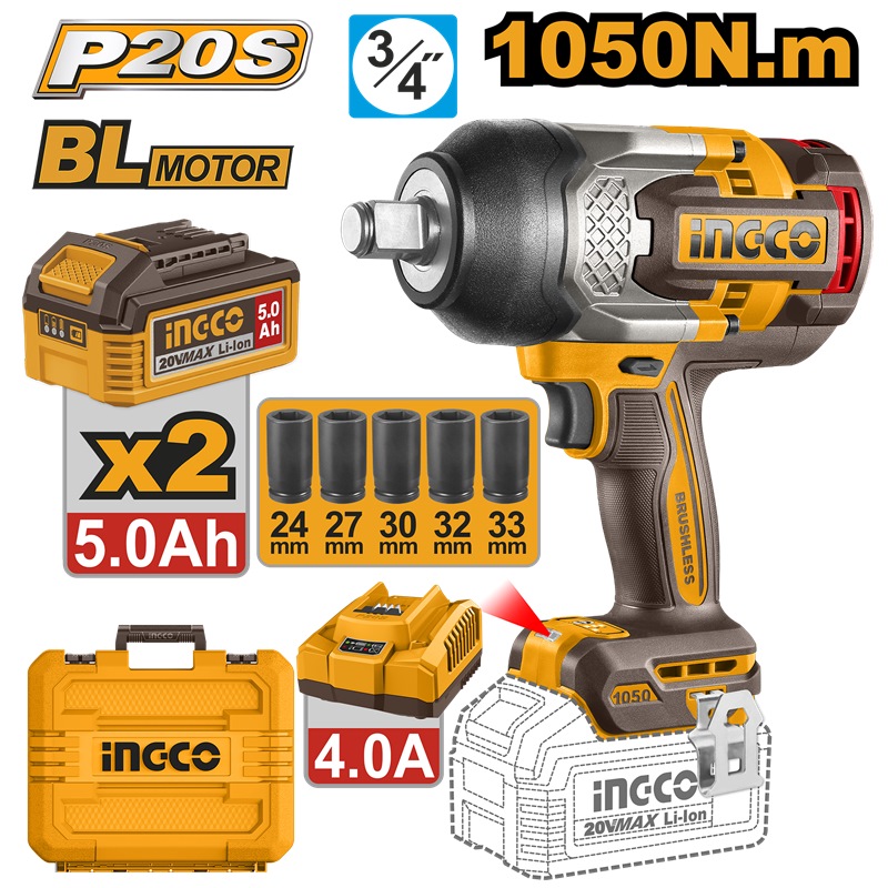 INGCO 20V BL 3/4" DR IMPACT WRENCH MAX 1050NM 2X5.0+CHRG+CASE CIWLI20105