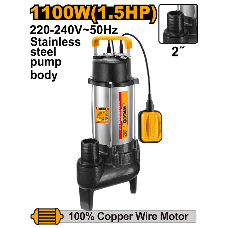 INGCO 2" SEWAGE SUBMERSIBLE PUMP W/FLOAT 1.5HP MAX 15MH, 22M3/HR SPD110068