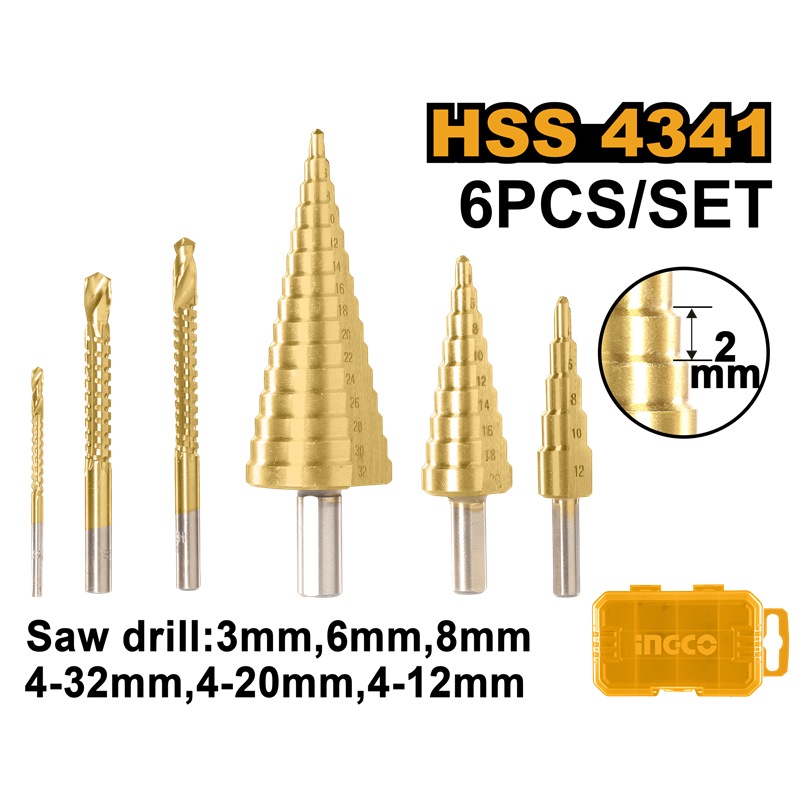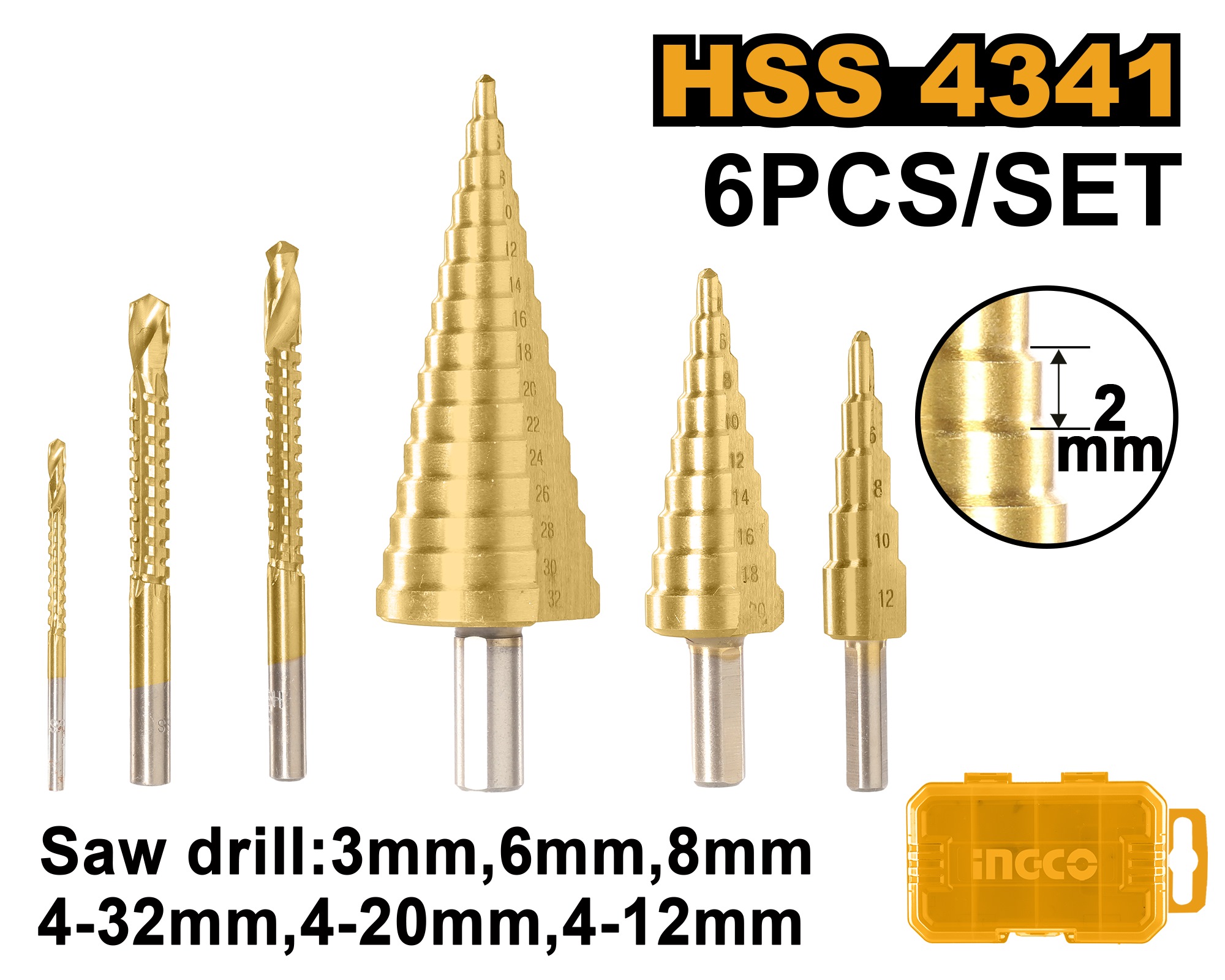 INGCO 3PC HSS STEPDRILL 4-12,4-20,4-32MM & 3PCS SAWDRILL 3,6,8MM AKSDS2061