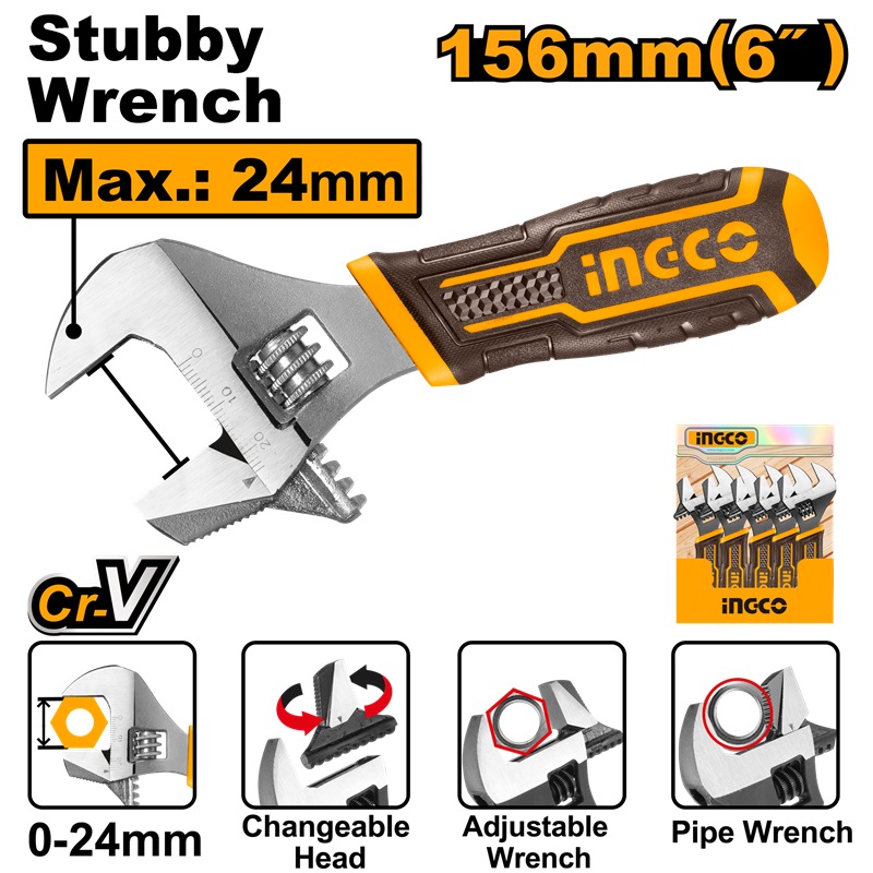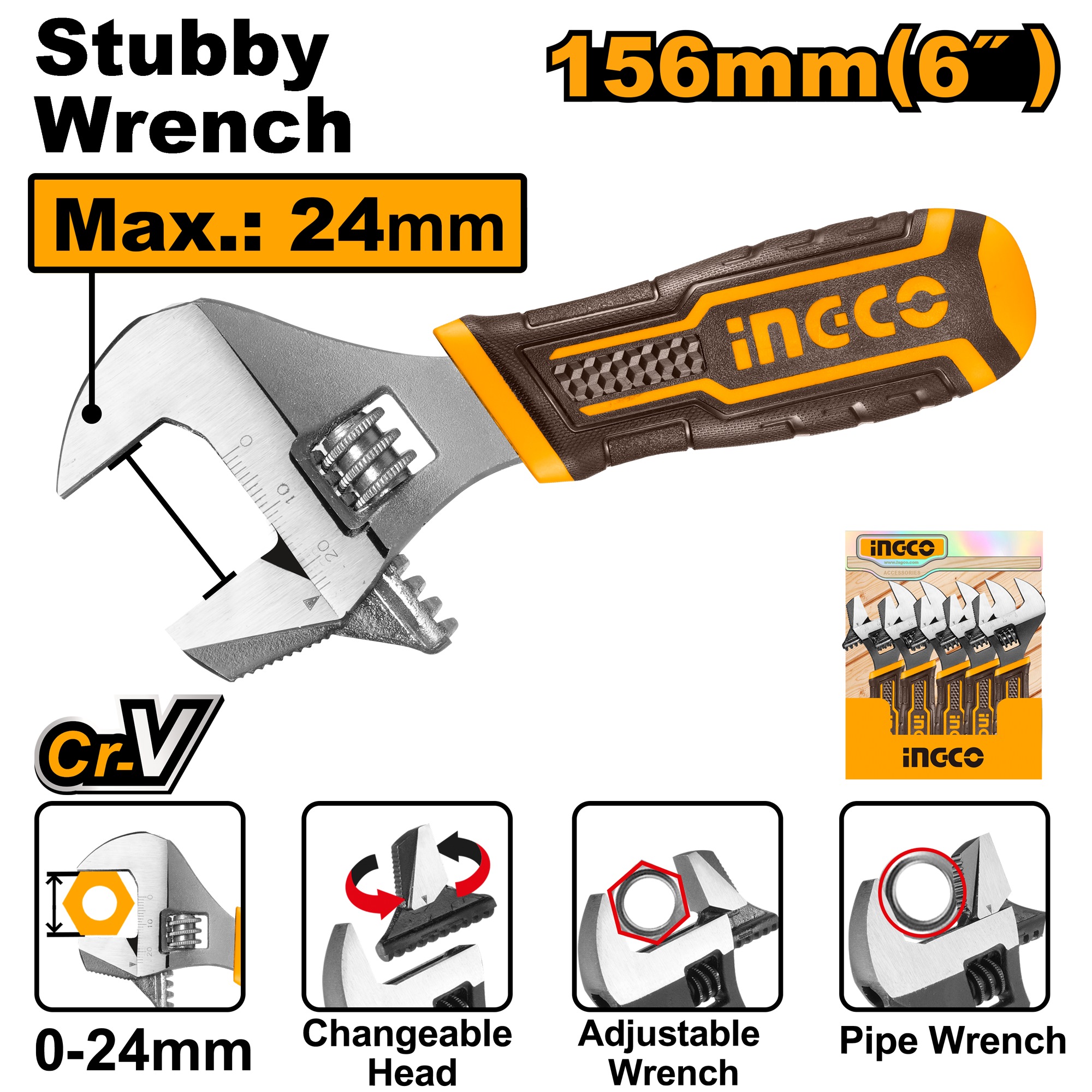 INGCO 2 IN 1 STUBBY ADJUSTABLE WRENCH 156MM 6" HADWS088