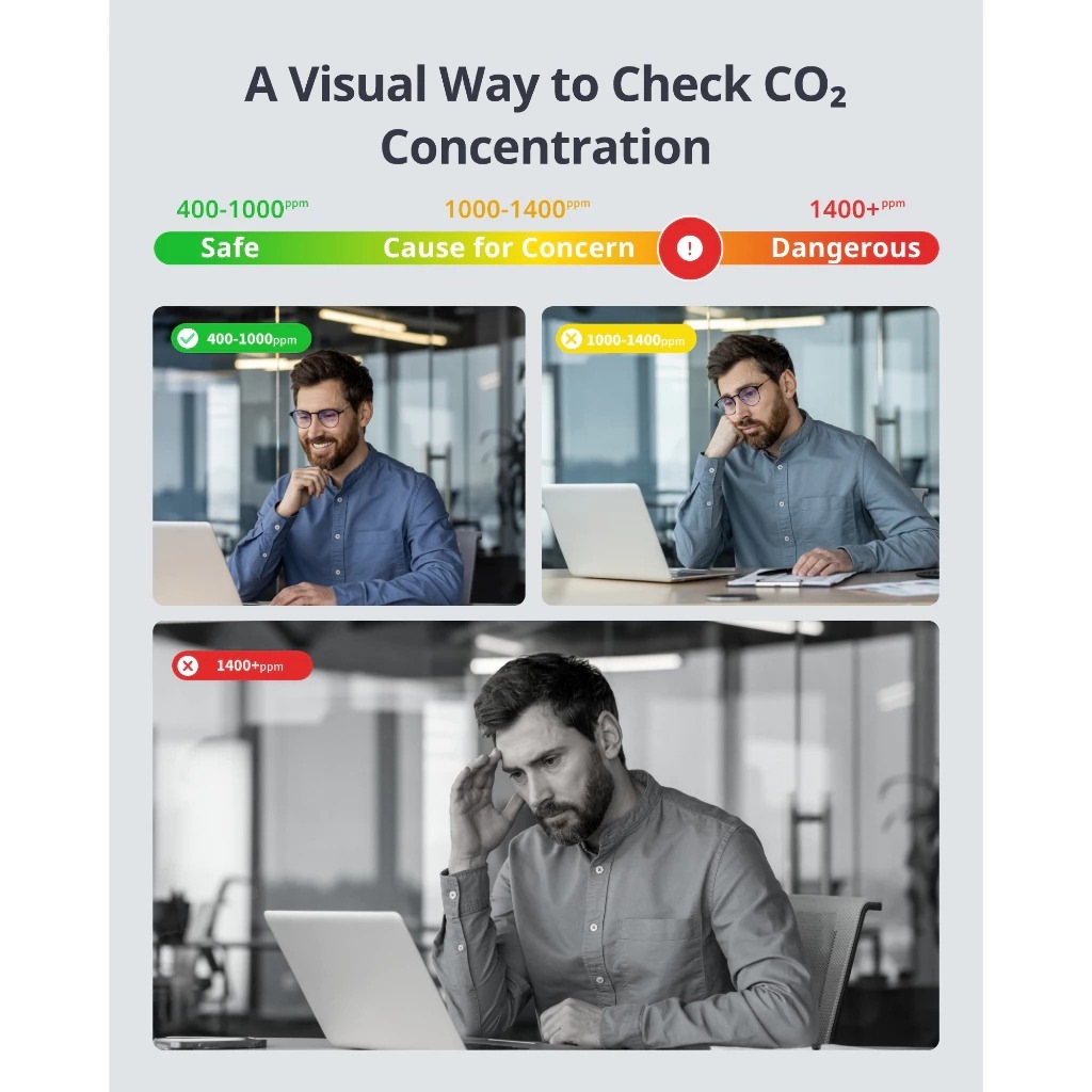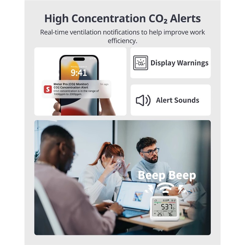 Adjust the CO2, temperature and humidity range with trigger warnings. If the limits are exceeded, you will be notified of acoustic alarms, visual screen alerts and app notifications (SwitchBot hub required). So you can effectively monitor the air quality at any time.