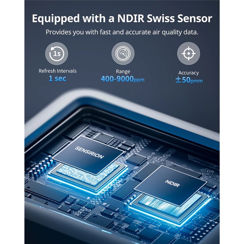 SwitchBot CO2 meter is equipped with Swiss industrial grade NDIR sensors and monitors air quality by measuring CO2 levels every 1 second with an accuracy of ±50ppm and a range of 400-9999ppm. Its high sensitivity and stability ensure fast and precise feedback on air quality.
