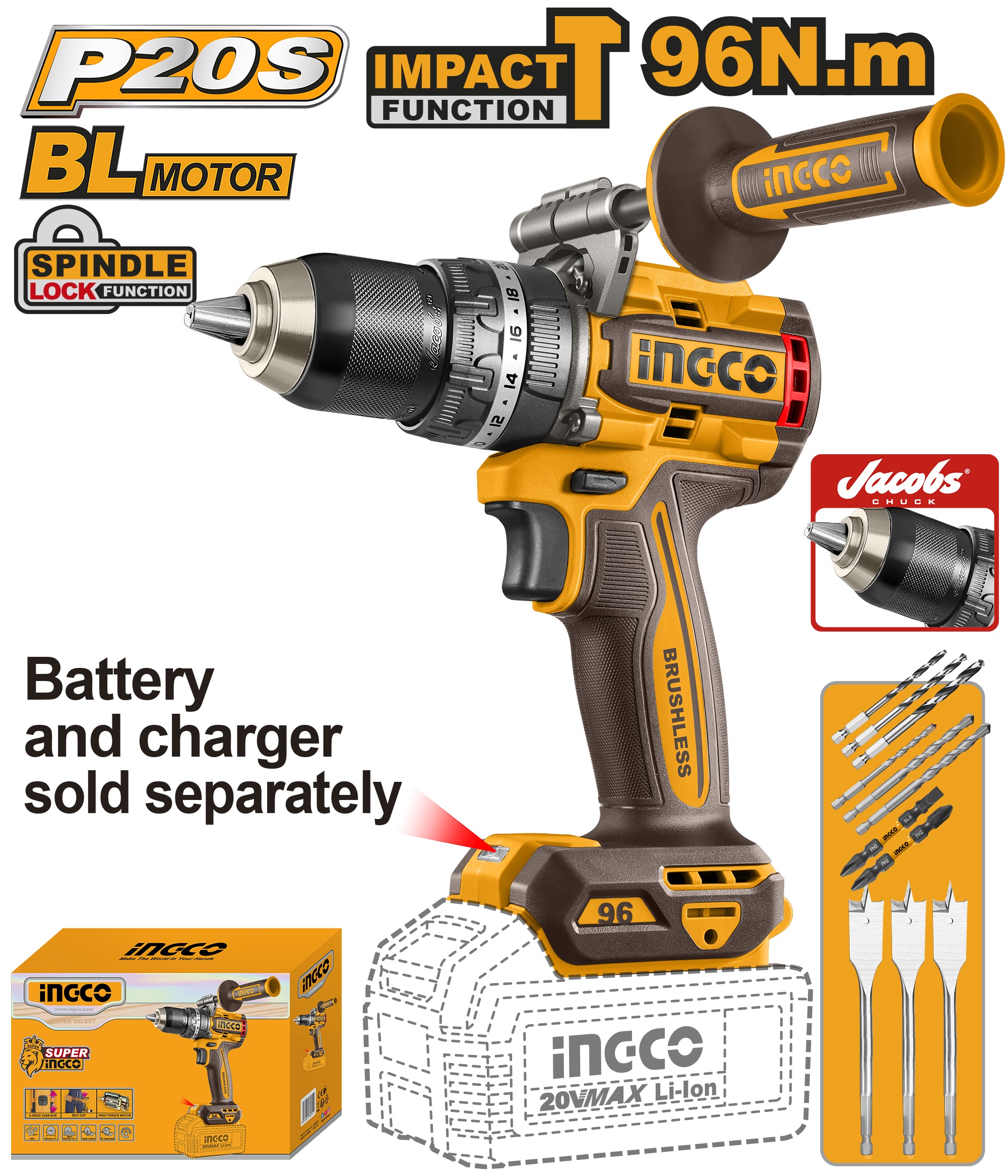 INGCO 20V LI-ION BL IMPACT DRILL 96NM CIDLI209685 (BARE UNIT)