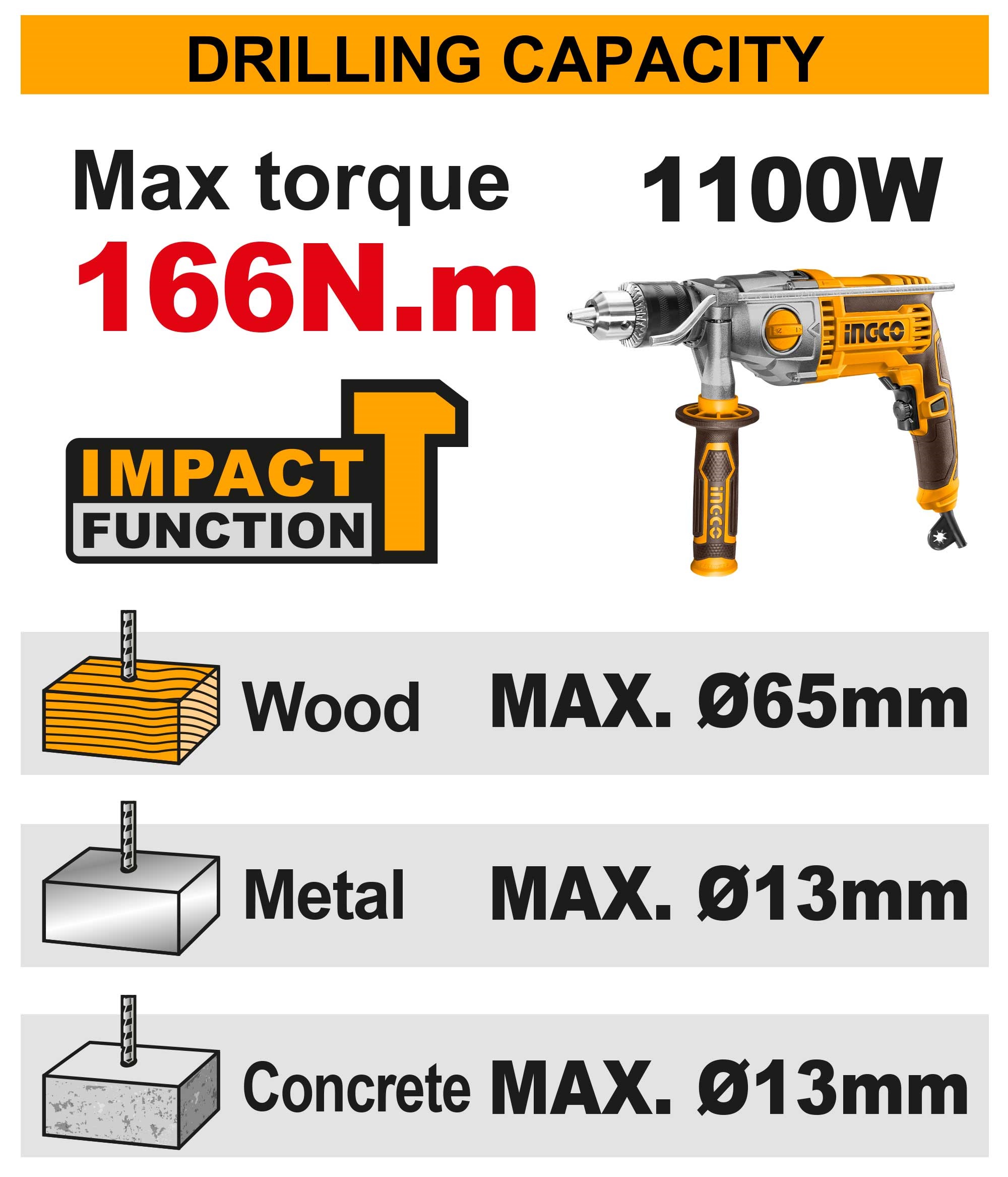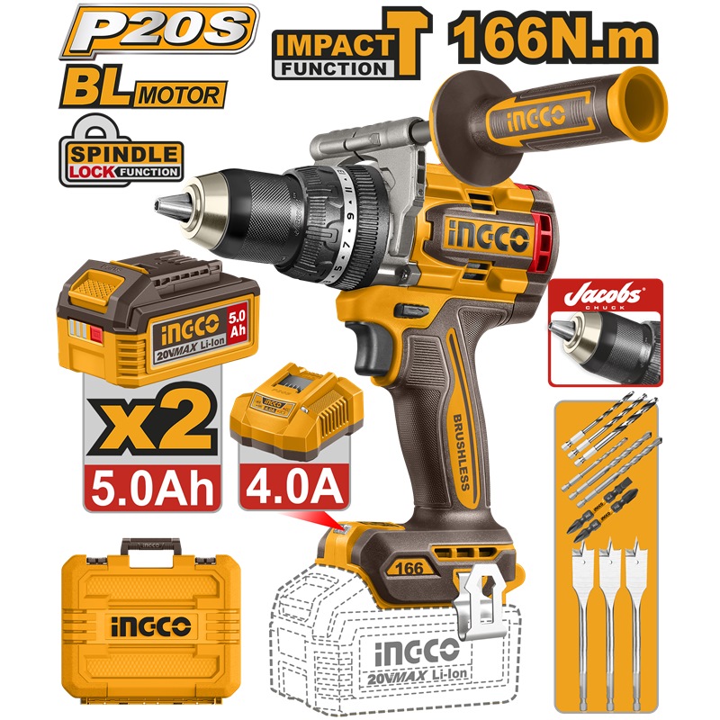 INGCO 20V BL HEAVY DUTY IMPACT DRILL 166NM 2X5 AH + BITS & CASE CIDLI201668