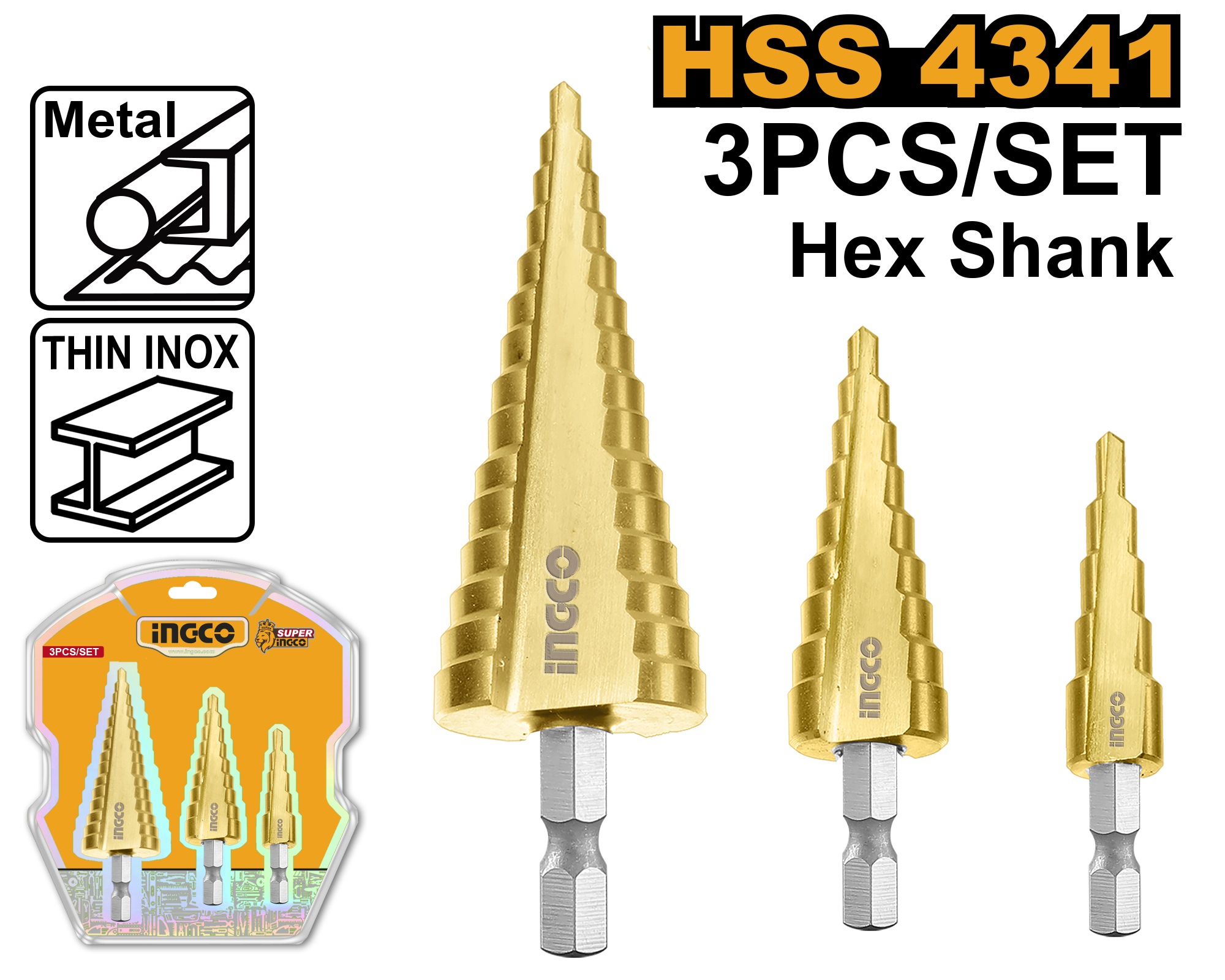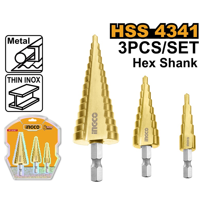 INGCO 3PC HSS STEP DRILL SET 4-12, 4-20, 4-32MM HEX SHANK AKSDS80402
