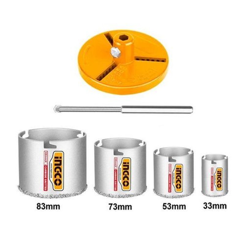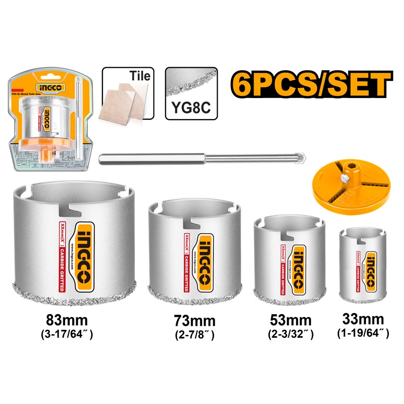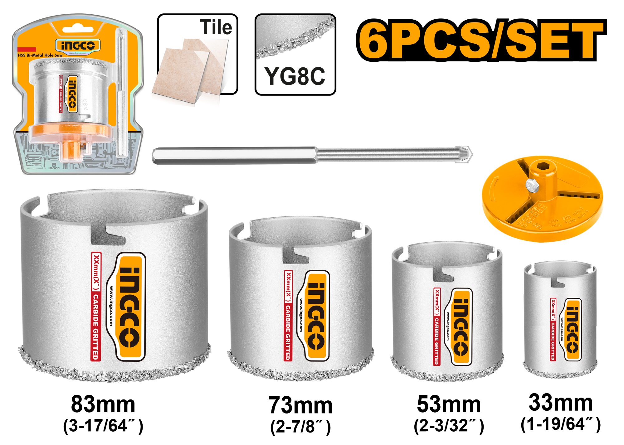 INGCO 6PCS CARBIDE GRIT HOLE SAW SET 33, 53, 73 & 83MM HSB4061
