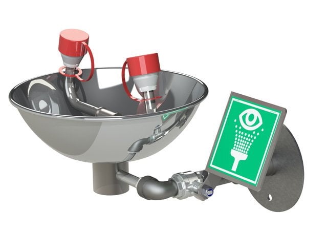This eye/ face wash with twin spray nozzles safeguarded by dust covers.