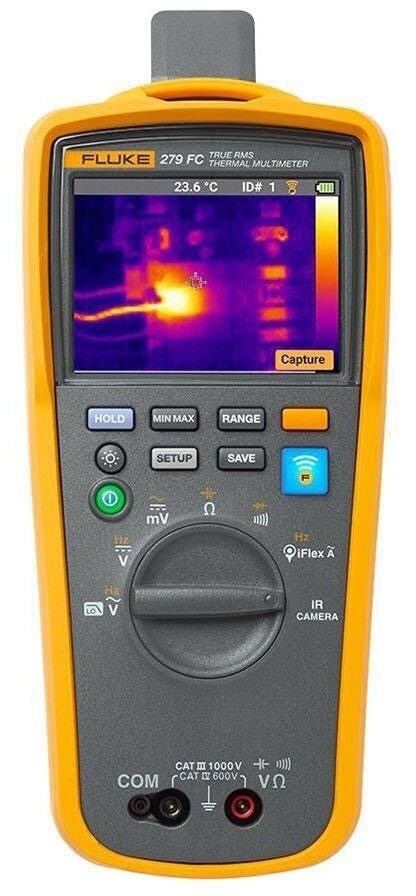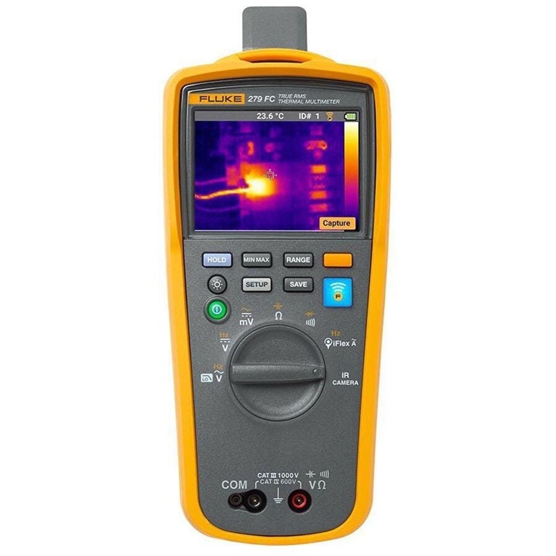 Thermal imaging multimeters are a first-line troubleshooting tool for electrical equipment that can check hot spots on high-voltage equipment and transformers, and detect heating of fuses, wires, insulators, connectors, splices and switches. Scanning with the 279 FC's thermal imager reveals many electrical issues rapidly and from a safe distance. By combining two tools into one, the thermal multimeter lightens the load and increases productivity.
