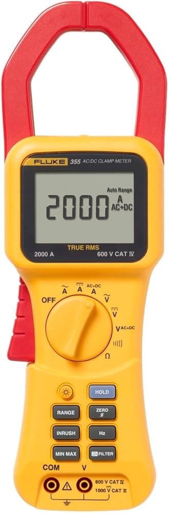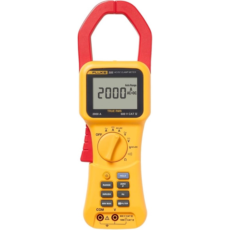 Versatile and rugged clamp meter for high currents Confidently take reliable readings with the True RMS Fluke 355 digital clamp meter, the tool of choice for high current clamp-on amp meter measurement up to 2000 A. The extra-wide jaw easily clamps around large conductors, typically found in high-current applications. The extra rugged design and CAT IV 600 V, CAT III 1000 V ratings add an extra element of user protection when taking high-powered measurements.