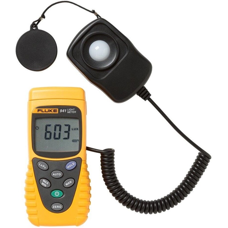 The Fluke 941 is a handheld luminometer than can measure visible light sent from a variety of light sources, to include fluorescent, metal halide, high pressure sodium, or incandescent lamps. With an extension cord to the light meter and separate display the Fluke 941 provides a handheld tool to accurately measure light in multiple environments. The Fluke 941 is a portable tool that measures light up to 20,000 fc of lux with an accuracy of .01 fc/lux.