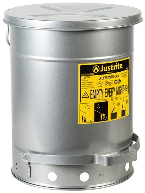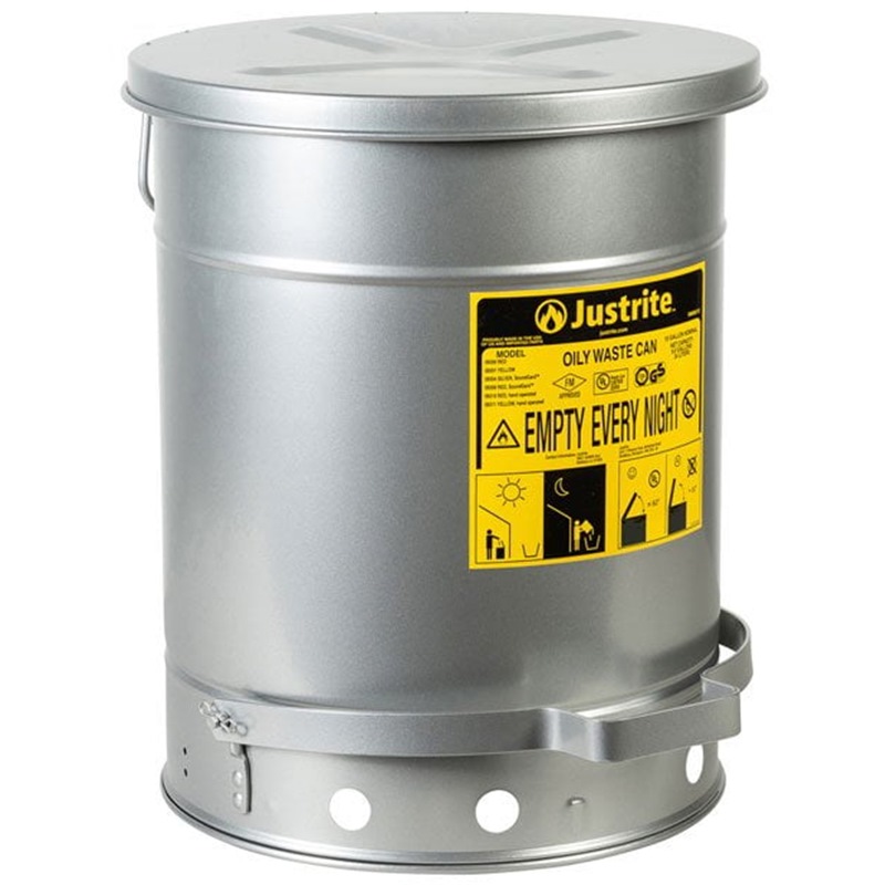 JUSTRITE 34L/10 GALLON OILY WASTE CAN, FOOT-OPERATED - 09304 (SILVER)