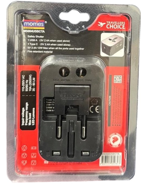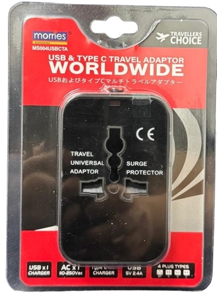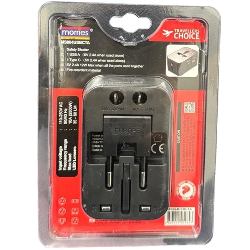 Home » Electrical & Lighting » Extension Cords & Travel Adaptors » MORRIES 5V 2.4A USB A + TYPE C WORLDWIDE TRAVEL ADAPTOR MS004USBCTA