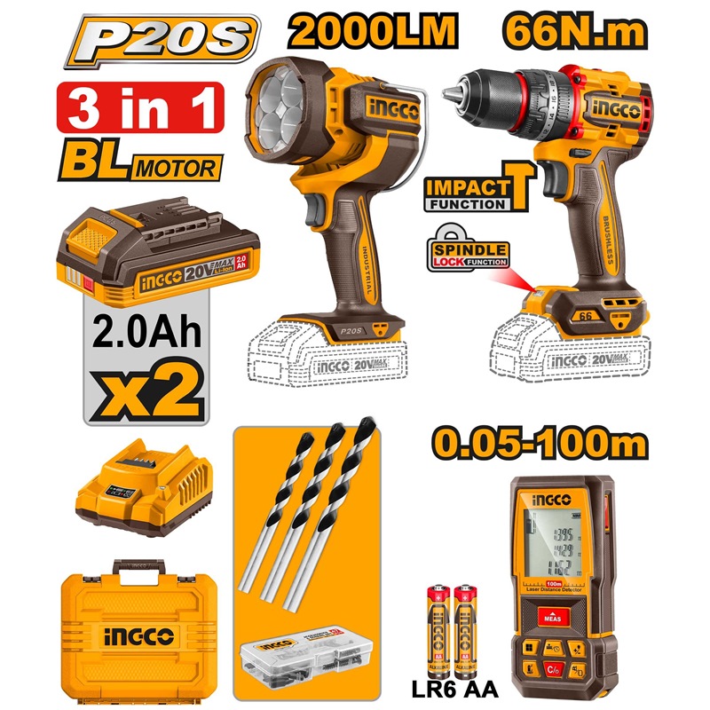 INGCO 3PC 66NM IMP DRILL+2000LUM LAMP+100M LASER DISTANCER COMBO COSLI250885