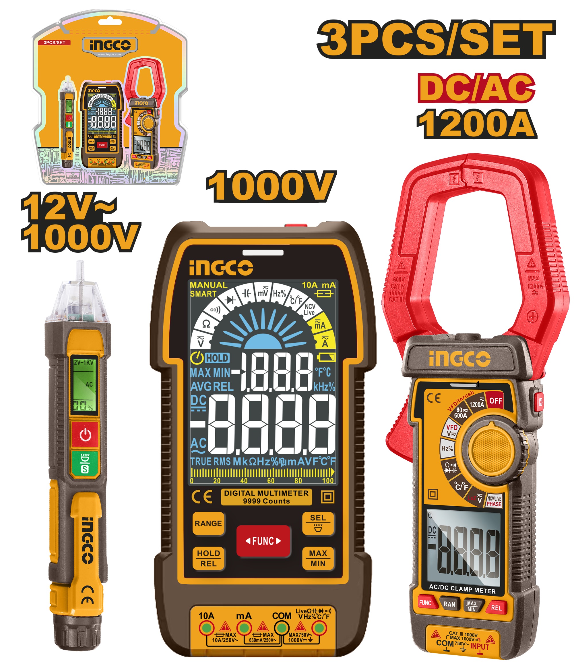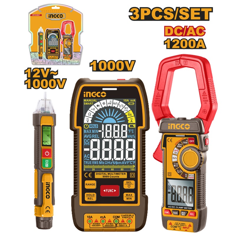 INGCO 3PC AC/DC CLAMP METER, DIGI MULTIMETER,VOLTAGE DETECTOR SET COS24069