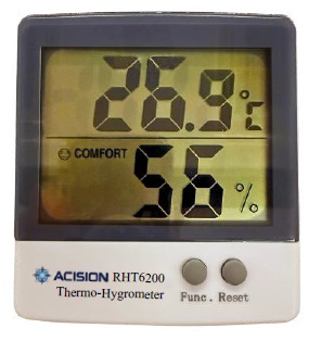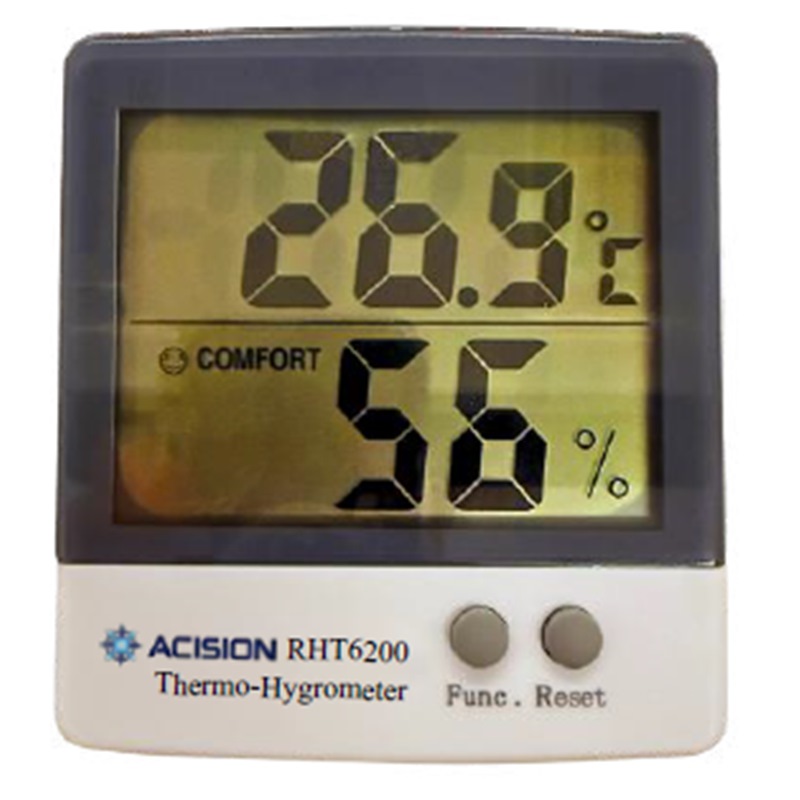 The Acision RHT6200 Thermo-Hygrometer measures both temperature and humidity in the air using two integrated sensors — a thermometer for temperature and a hygrometer for humidity.