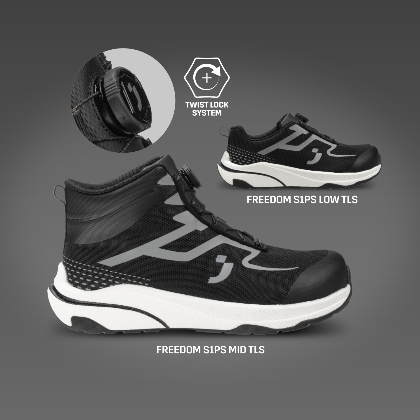 Free your toes with the FREEDOM S1PS LOW TLS. Designed to move with you, the anatomically shaped toe cap supports the natural biomechanics of your foot. It gives you room to breathe, flex and move smoothly - just as nature intended - while keeping you protected. The advanced eTPU/rubber outsole provides exceptional slip resistance on both dry and extremely slippery surfaces, while the metal-free, anti-perforation midsole offers lightweight protection without sacrificing durability. The Twist Lock System allows you to securely pull on your safety shoes in an instant. An abrasion-resistant toe cap prevents scuffing and extends the life of the shoe.