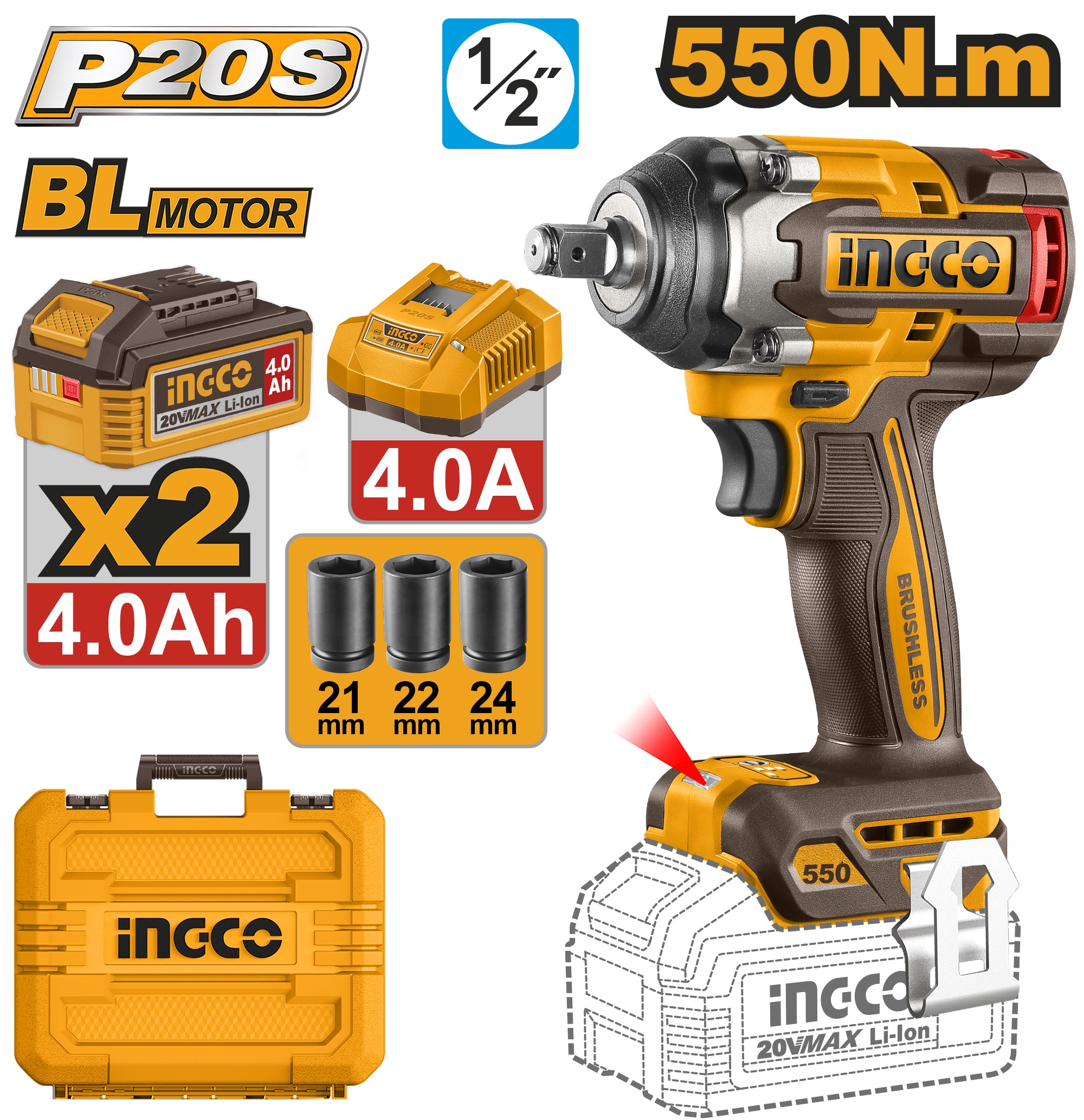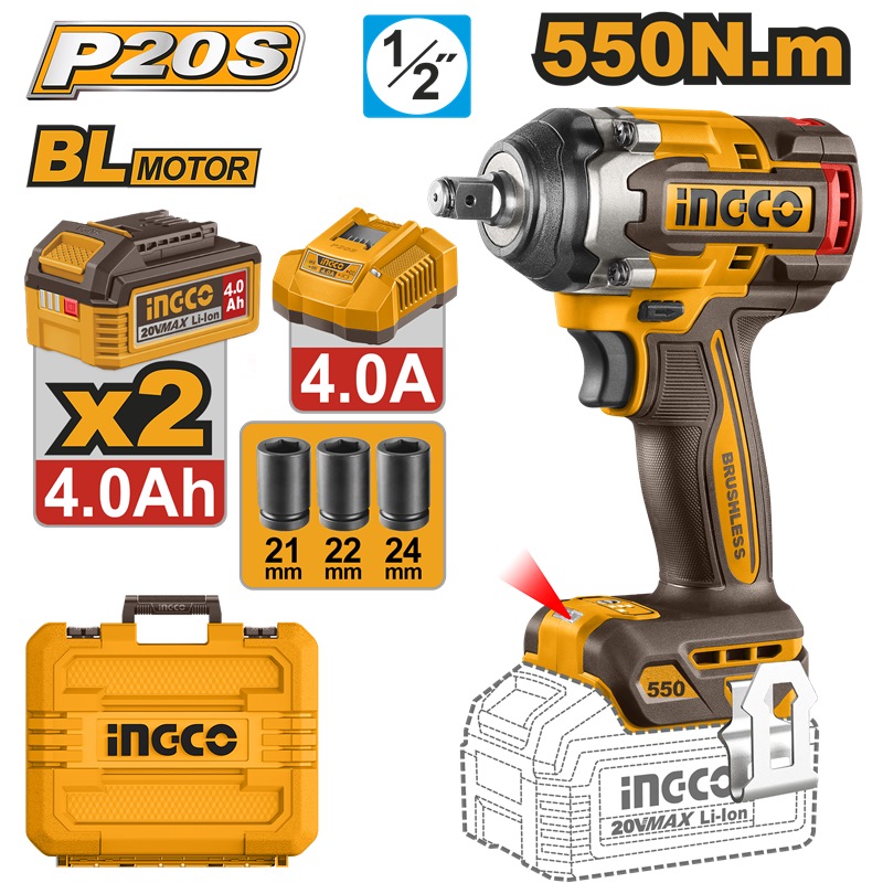 INGCO 20V BL 1/2" IMPACT WRENCH 550NM,2X 4.0AH, CHARGER & CASE CIWLI2055