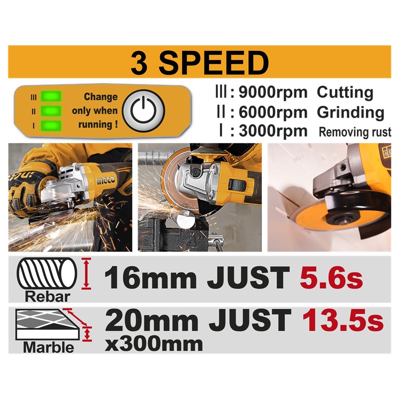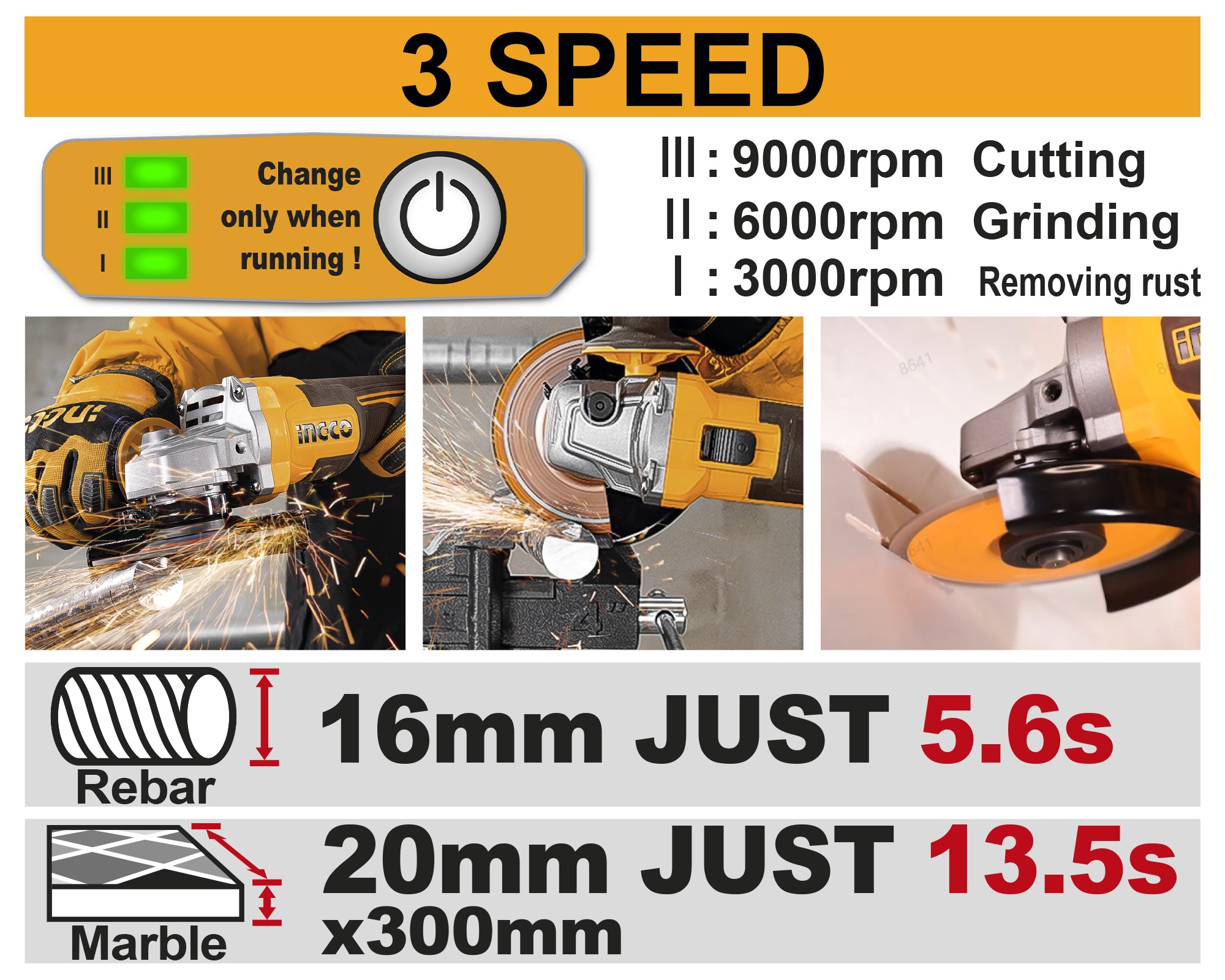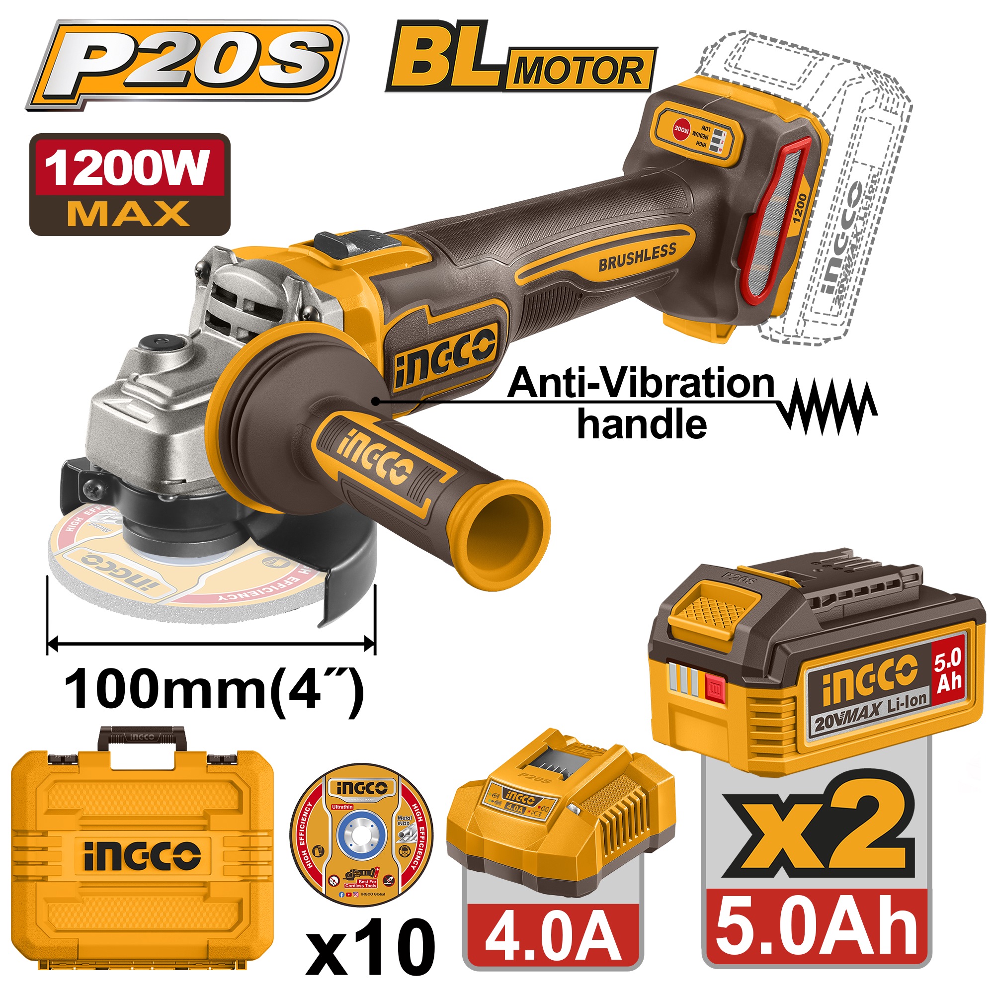 INGCO 20V LI-ION 3-SPEED ANGLE GRINDER 4" 1200W 2X5.0AH+CASE CAGLI2120232