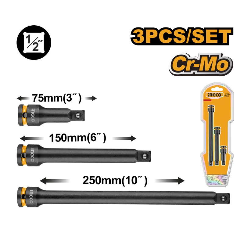Home » Hand Tools » Sockets & Ratchets » INGCO 3PCS CR-MO IMPACT EXTENSION BAR SET 1/2"X 3", 6" & 10" HKISEB12031