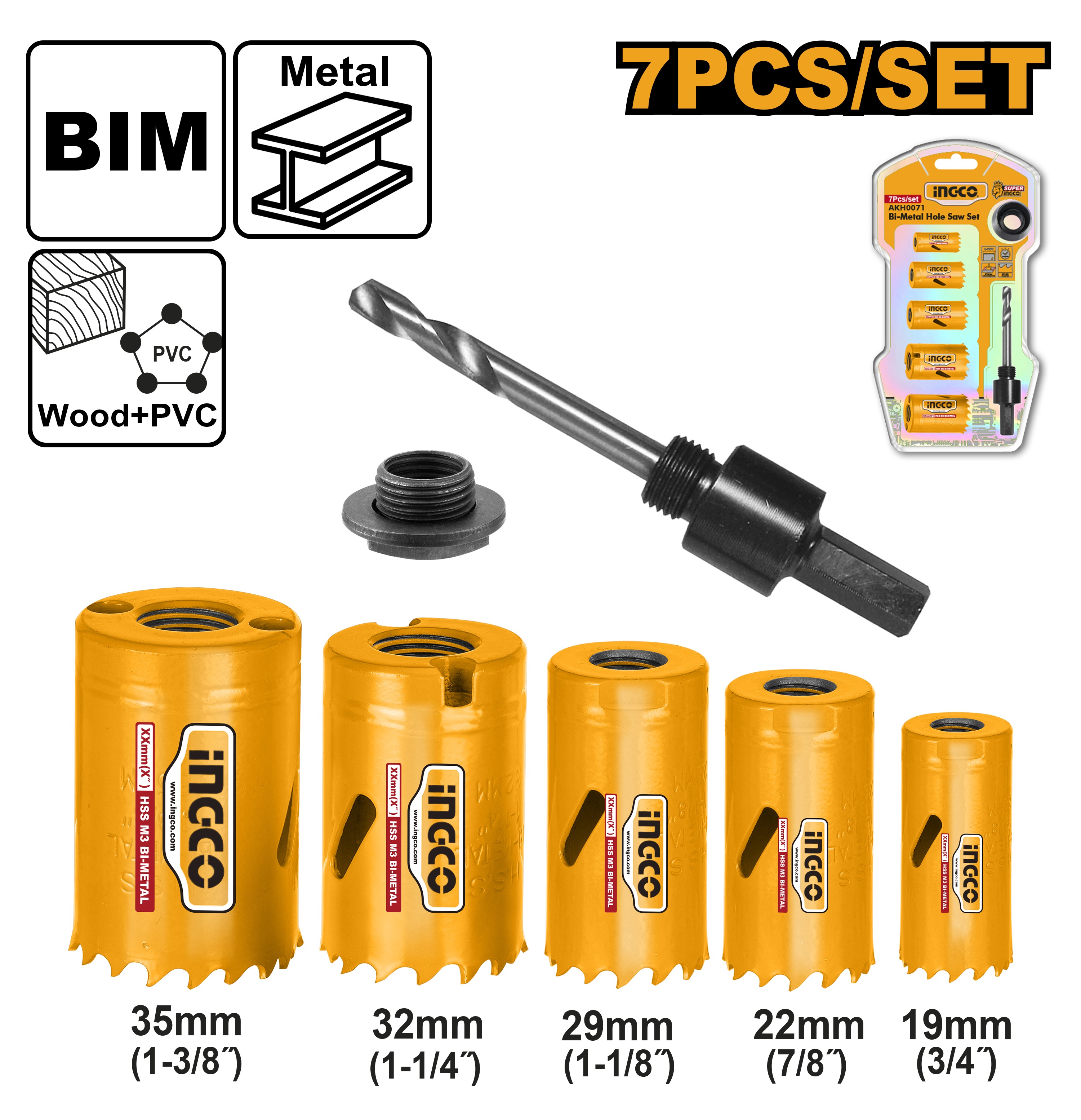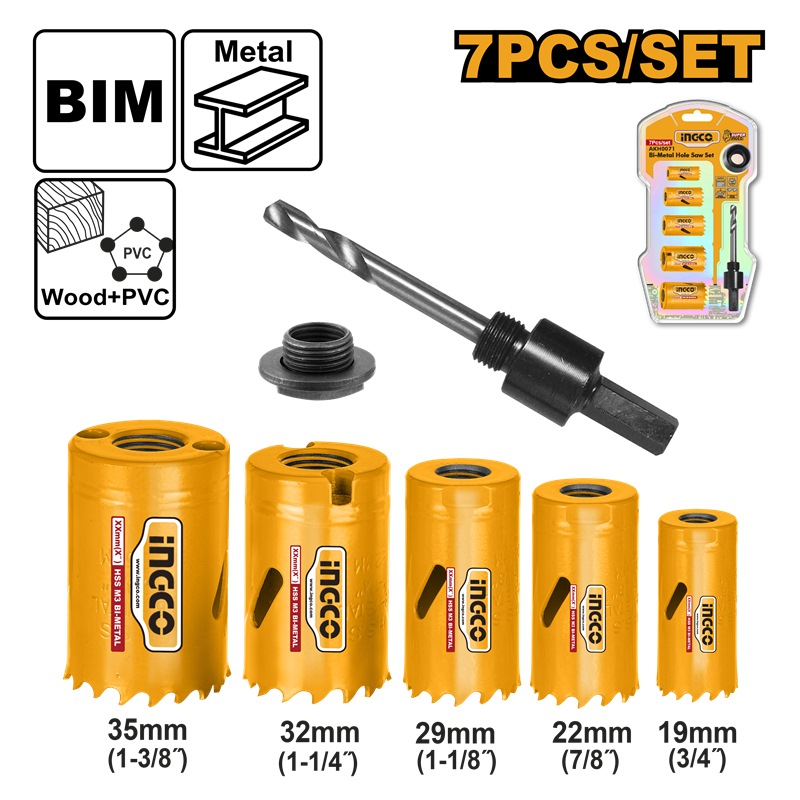 INGCO 7PCS BI-METAL HOLE SAW 19,22,29,32,35+ARBOR SET AKH0071