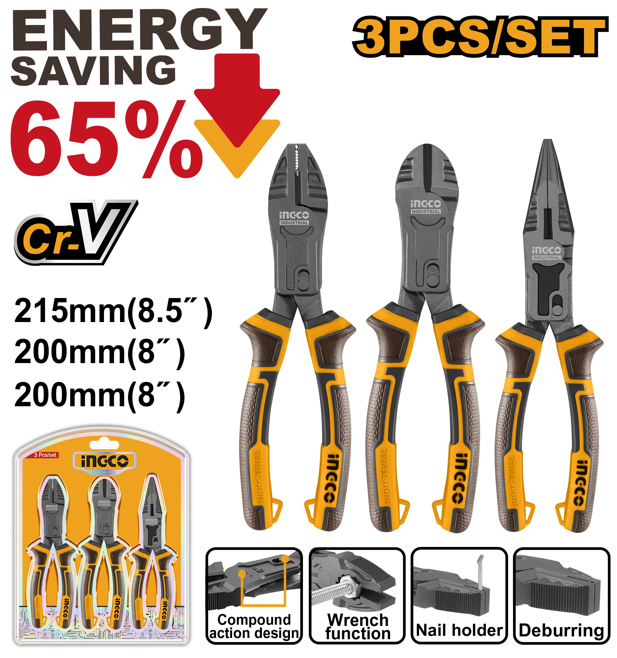 INGCO 3PCS COMPOUND ACTION PLIER SET HKCPS5831