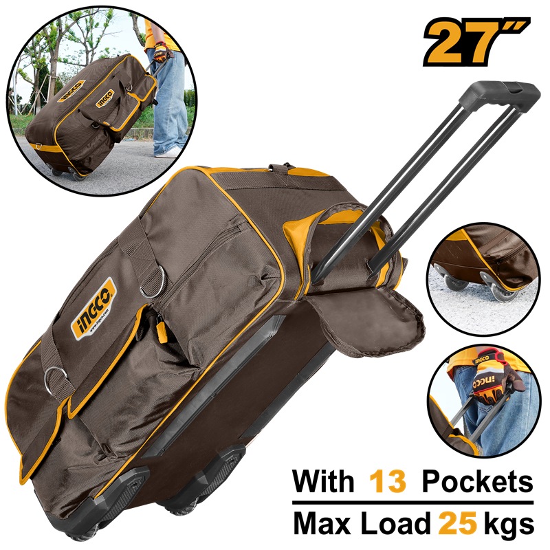 Home » Ladders, Trolleys & Storage » Toolboxes, Tool Bags & Work Benches » INGCO 27" TELESCOPIC PULL HANDLE WHEELED TOOL BAG 685X295X320MM HRRTB2715
