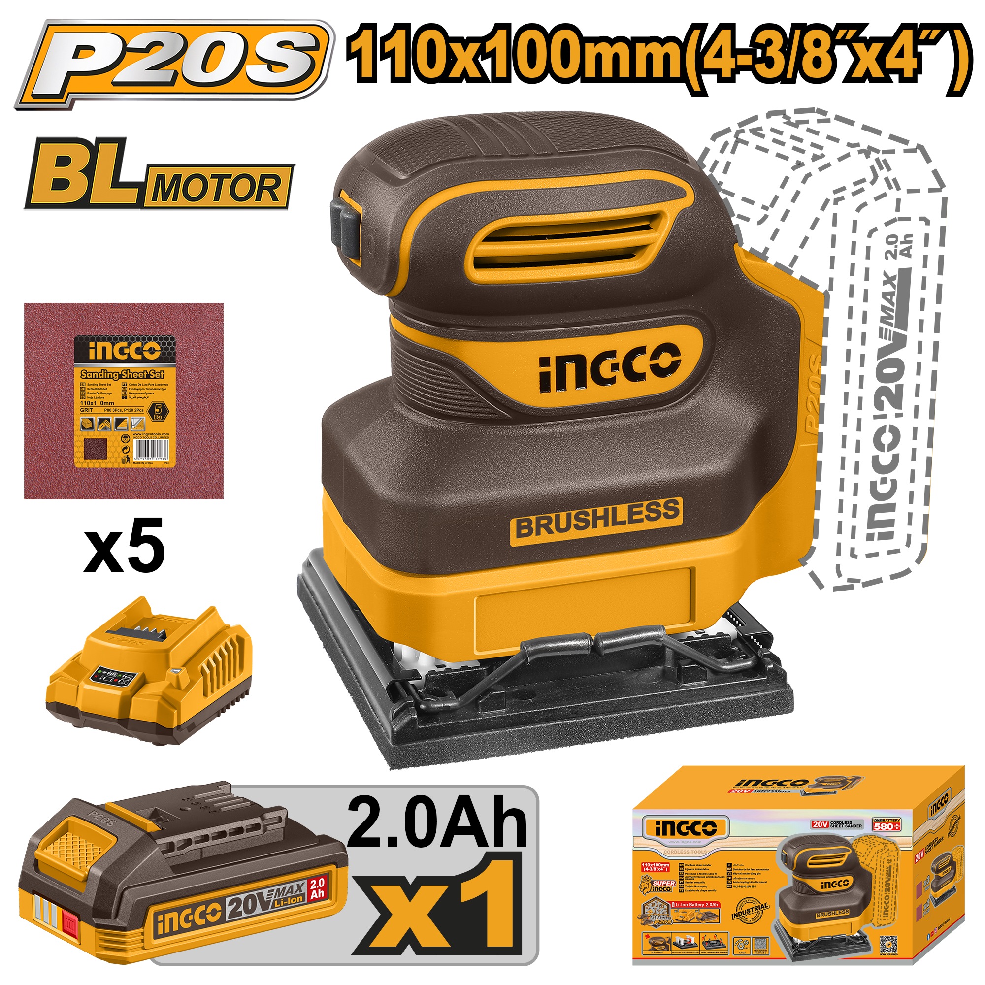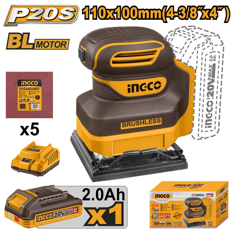 INGCO 20V BL SHEET SANDER 110X100MM 1X2.0AH & CHARGER CSHSLI20241