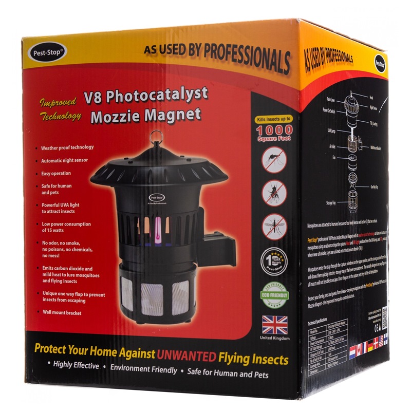 Pest-stop professional V8 photocatalyst Mozzie magnet can lure and capture the mosquitoes using an advance tripartite system. Heat, UV black light produced from the UVA lamp and CO2 produced when ultraviolet rays are radiated onto the titanium dioxide (TIO2).
