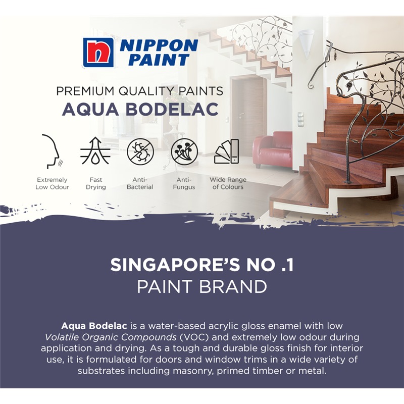 Nippon Paint Aqua Bodelac is a water-based acrylic enamel paint specially designed for interior and exterior wood and metal surfaces for a non-yellowing, tough and durable gloss finishes.