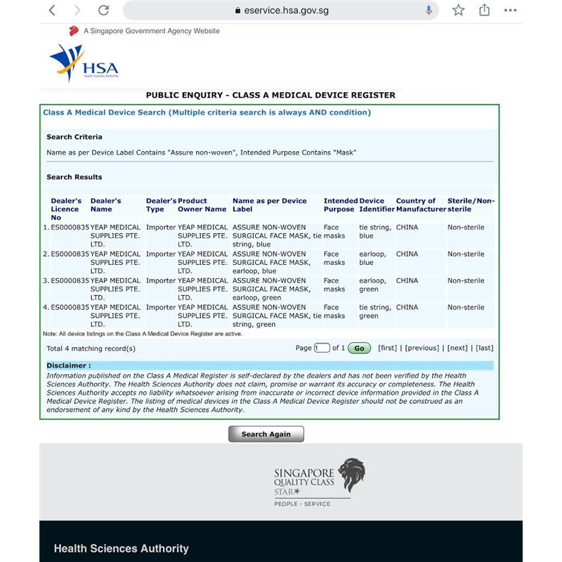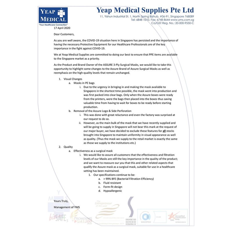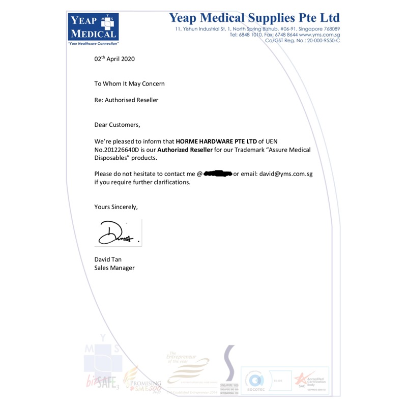 Horme Hardware Pte Ltd is the authorised reseller of Assure Medical Disposable, please click here for official letter