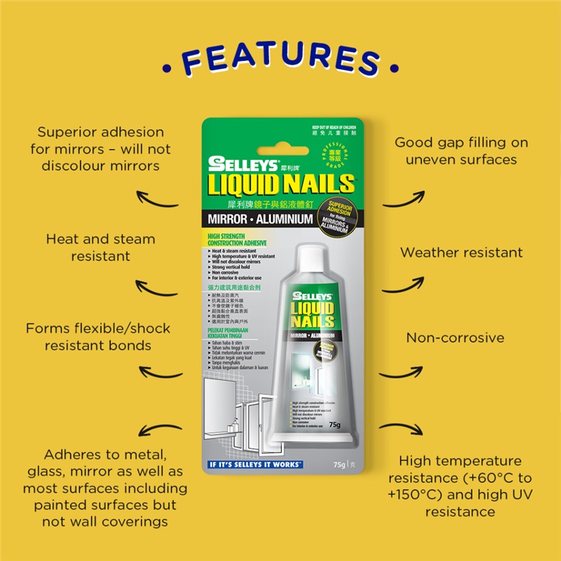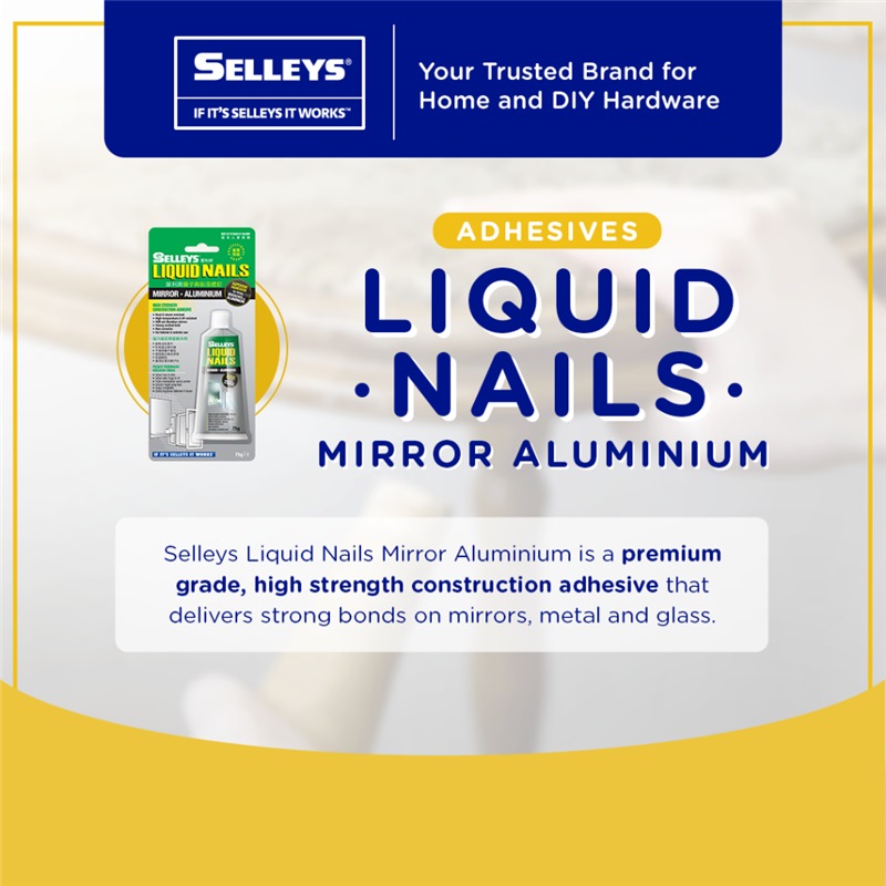 Selleys Liquid Nails Mirror Aluminium is a premium grade, high strength construction adhesive that delivers strong bonds on mirrors, metal and glass.