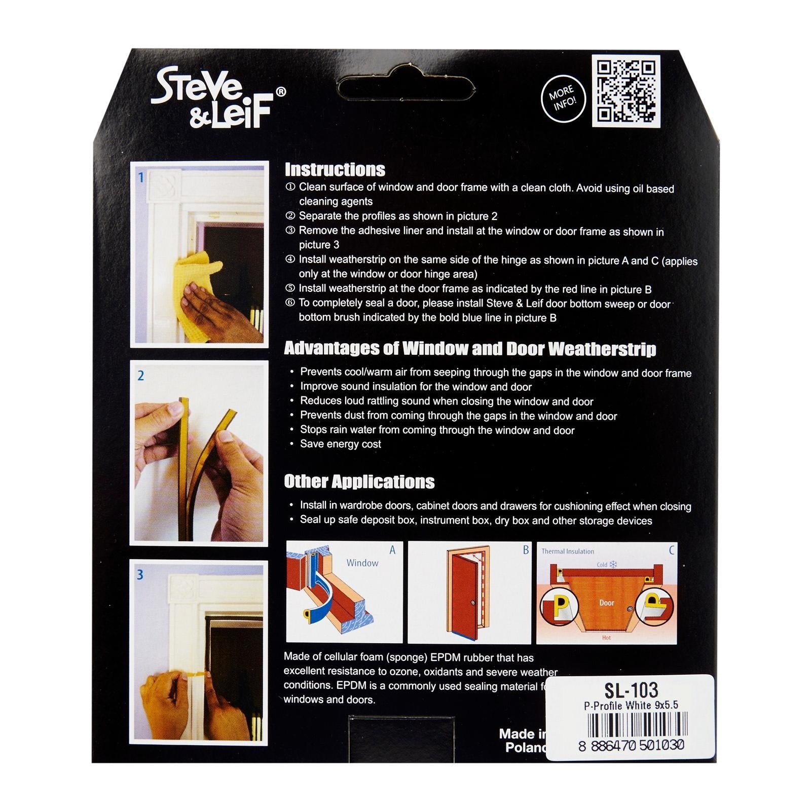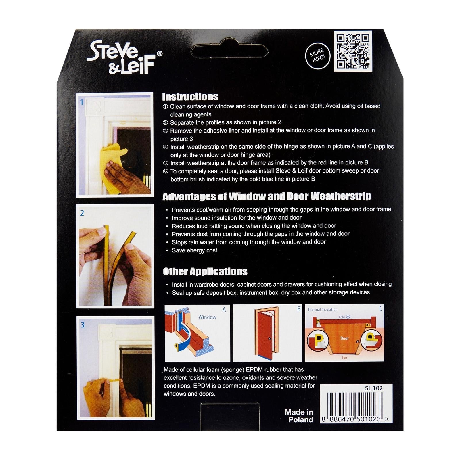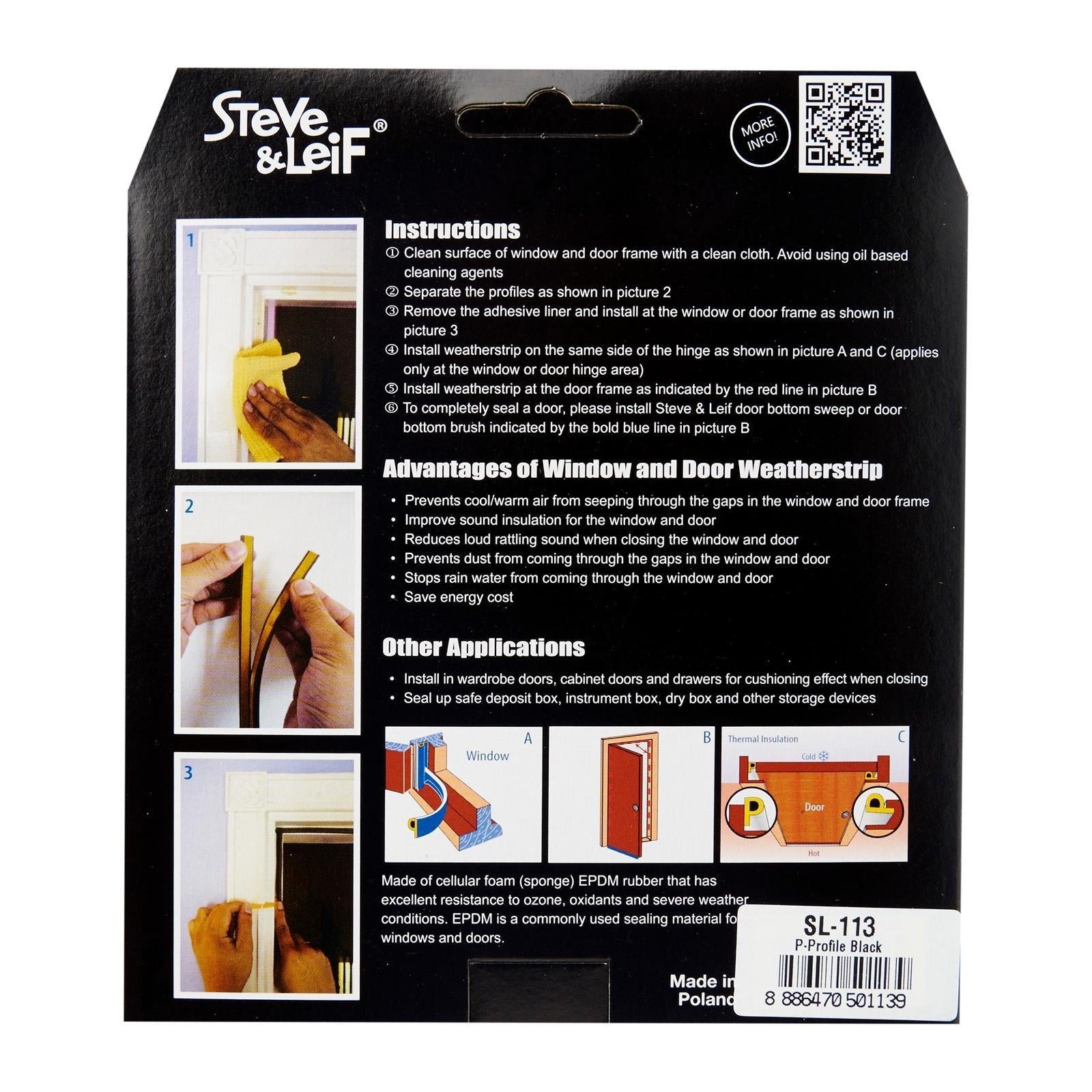 Steve & Leif's P-Profile Weather Strip made of cellular foam (sponge) EPDM rubber that has excellent resistance to ozone, oxidants and severe weather conditions. EPDM is commonly used sealing material for windows and doors. Ideal for sealing doors in Bedrooms, living rooms, study rooms, meeting rooms, etc. for cushioning effect when closing. Available in Black, Brown, Grey and White to match your home interior design.