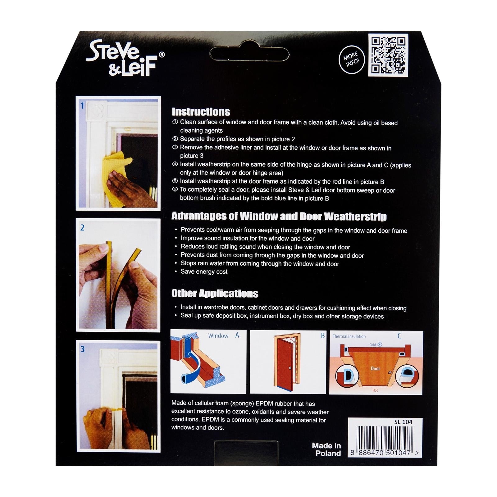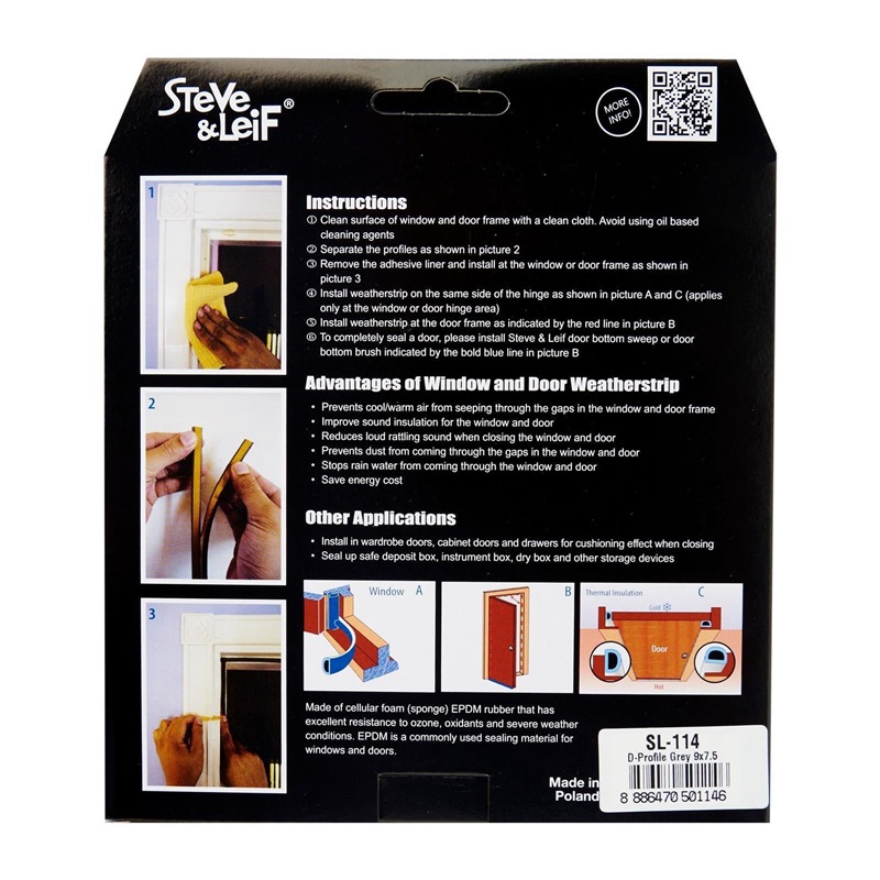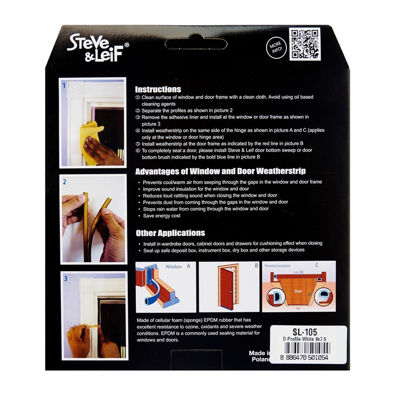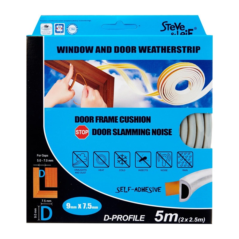 Steve & Leif's D-Profile Weather Strip made of cellular foam (sponge) EPDM rubber that has excellent resistance to ozone, oxidants and severe weather conditions. EPDM is commonly used sealing material for windows and doors. Ideal for sealing doors in Bedrooms, living rooms, study rooms, meeting rooms, etc. for cushioning effect when closing. Available in Black, Brown, Grey and White to match your home interior design.