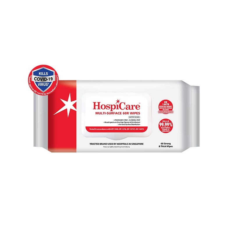 HospiCare Waterbased Disinfectant Wipes 60R are broad spectrum, one-step disinfectant wipes. This formulation delivers effective biocidal action against bacteria, fungi, viruses and exceptional cleaning performance that kills 99.99% germs. Its non-woven material effectively traps dirt on surfaces. Its alcohol-free solution does not damage any surface, rubber, plastic, metal or even fabrics. Tested against EN 1040, EN 1275, EN 1276, EN 13727, EN 14476 – Effective against enveloped viruses including Coronaviruses.