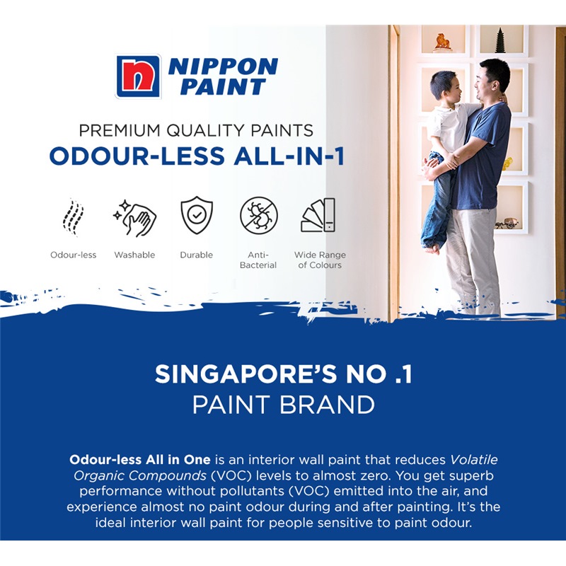 Nippon Paint Odour-less All-In-1 is an environmentally favorable green product formulated without VOCs (Volatile Organic Compounds) for interior use.