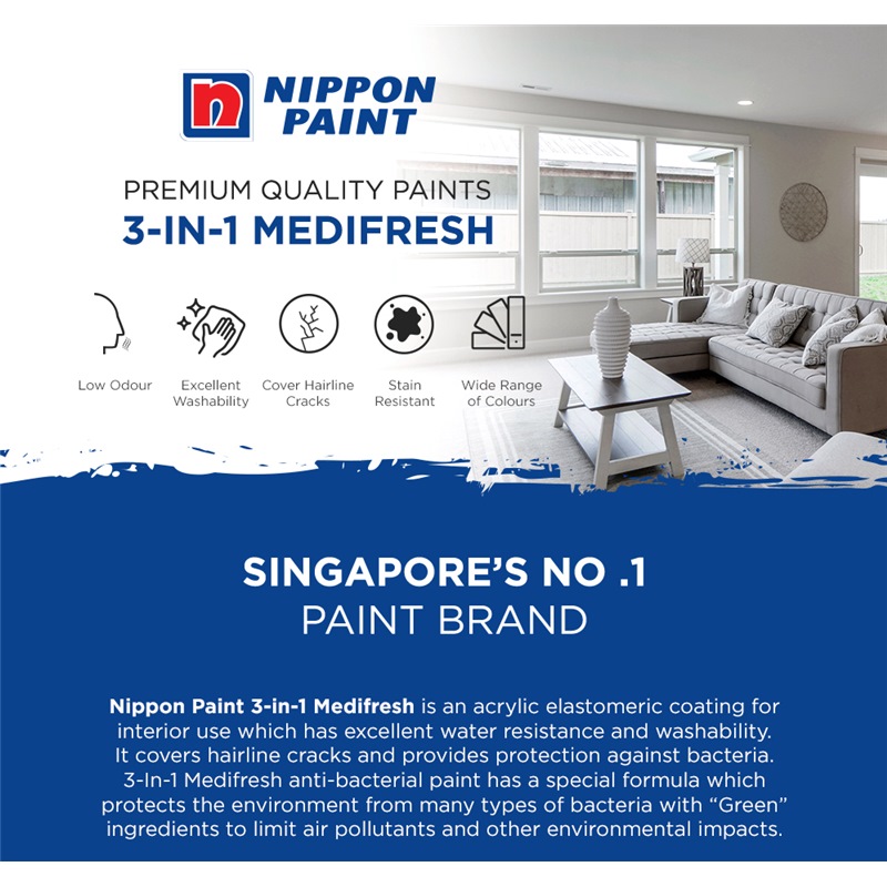 Nippon Paint 3-in-1 Medifresh anti-bacterial paint is a long-lasting coat that promotes better hygiene and health, while keeping the surroundings clean and fresh