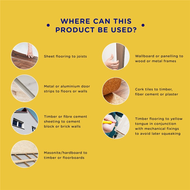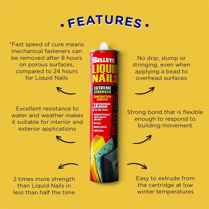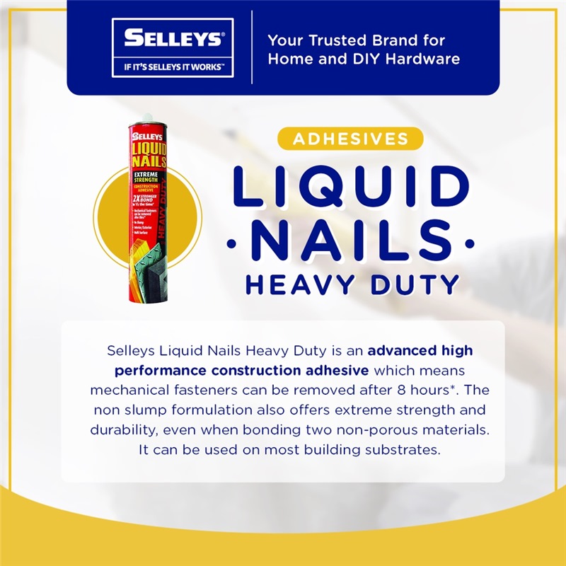 Selleys Liquid Nails Heavy Duty is an advanced high performance construction adhesive which means mechanical fasteners can be removed after 8 hours*. The non slump formulation also offers extreme strength and durability, even when bonding two non-porous materials. It can be used on most building substrates.