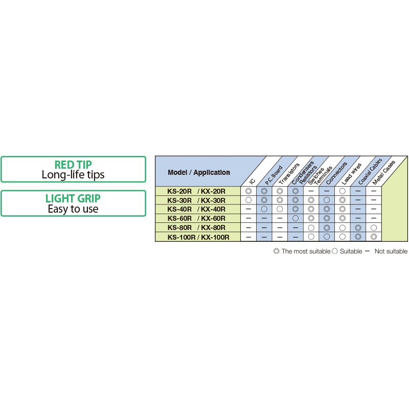 Please note: The soldering iron’s heater bobbin (cylindrical metal around which the nichrome wire was wound) was changed from iron to stainless steel, to improve the life of the nichrome soldering iron heater. This improved the heat transfer efficiency of the heater calorific value to the tip. After considering the compatibility of the tip, the power power consumption for KX-60R, KX-80R & KX-100R was changed to 45W as a result.