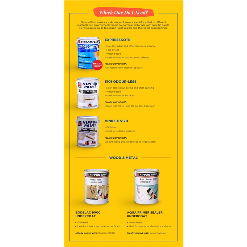 Nippon Paint Vinilex 5170 is an Oil-based Wall Sealer containing a superior resin/binder specifically formulated to protect the finishing coats against the effects of alkalinity and moisture from the walls.