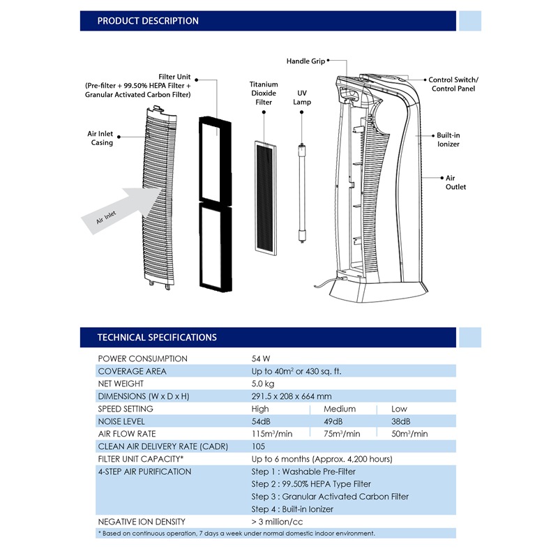 6 Multistage cleaning system (Pre-filter, HEPA. Activated carbon filter, TiO2 Filter, UV Light, Ionizer)