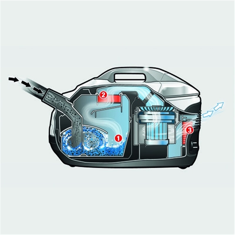 The dirt that has been sucked has to pass through the swirling water, and is thereby very efficiently filtered from the air and bound in the water.
